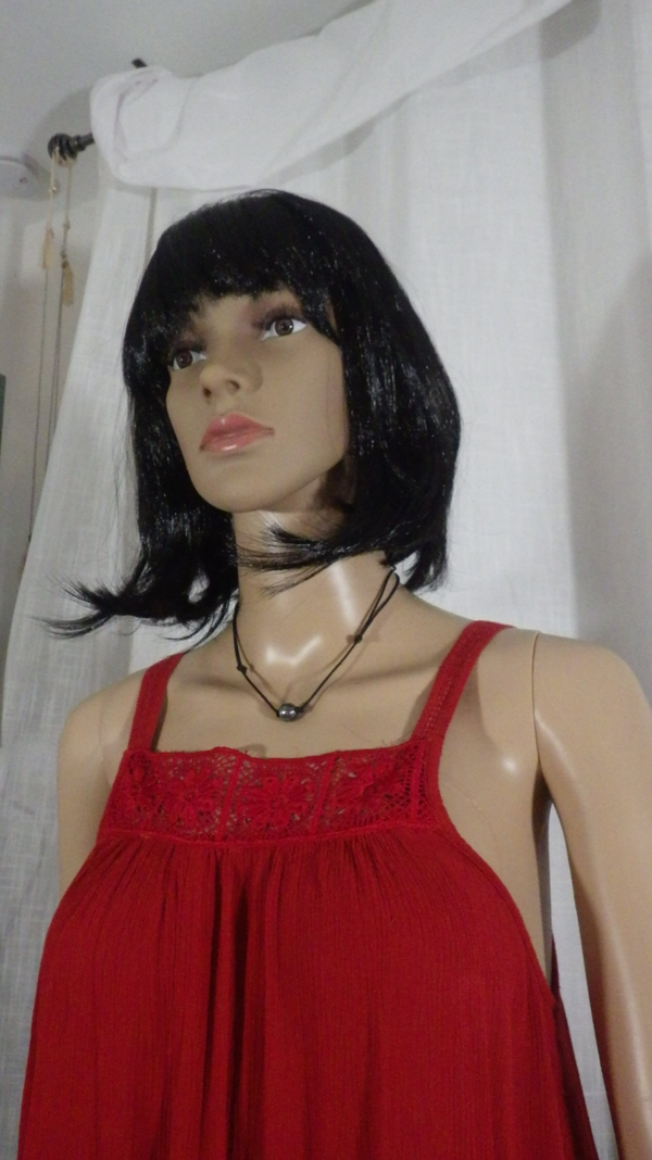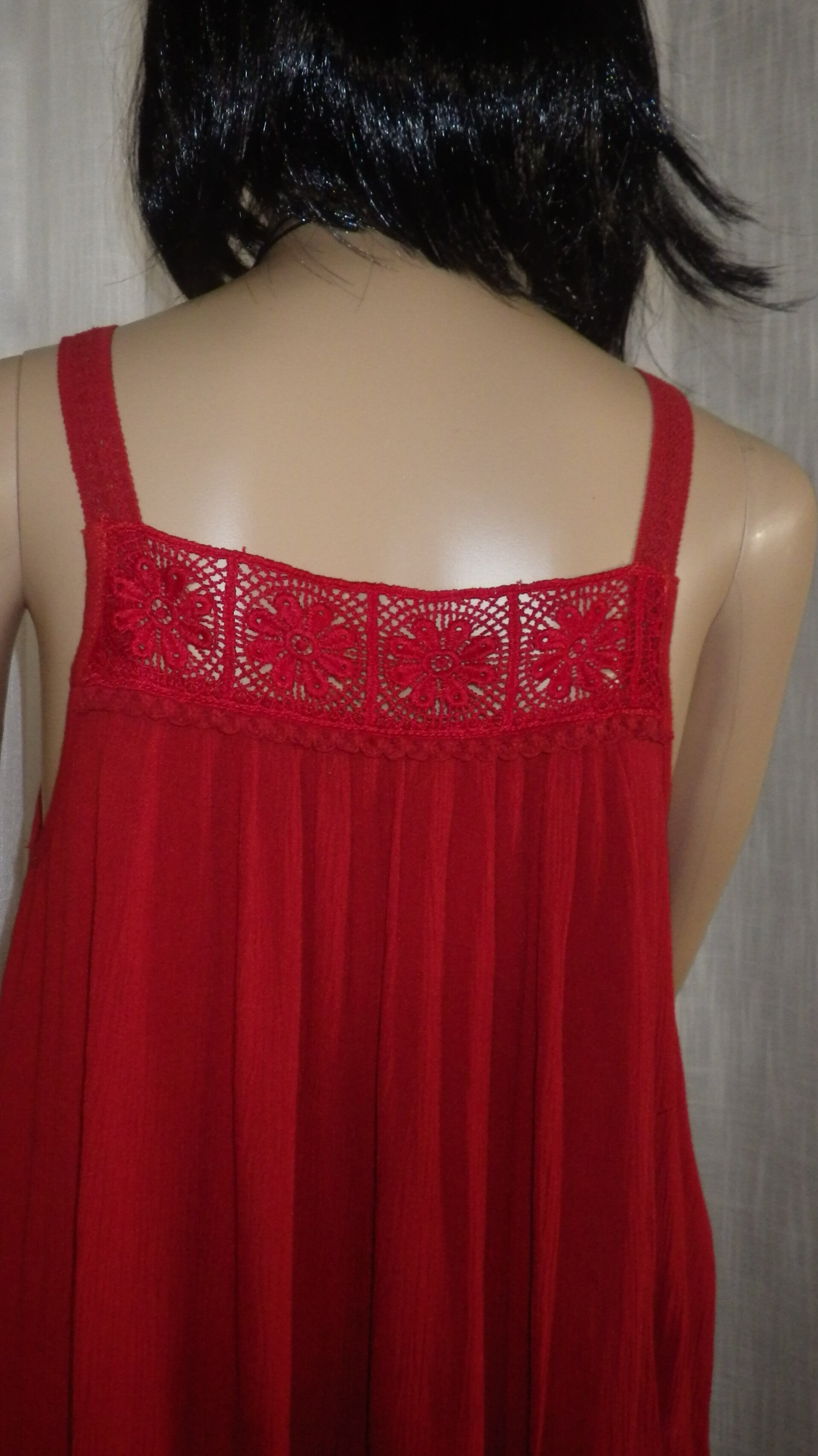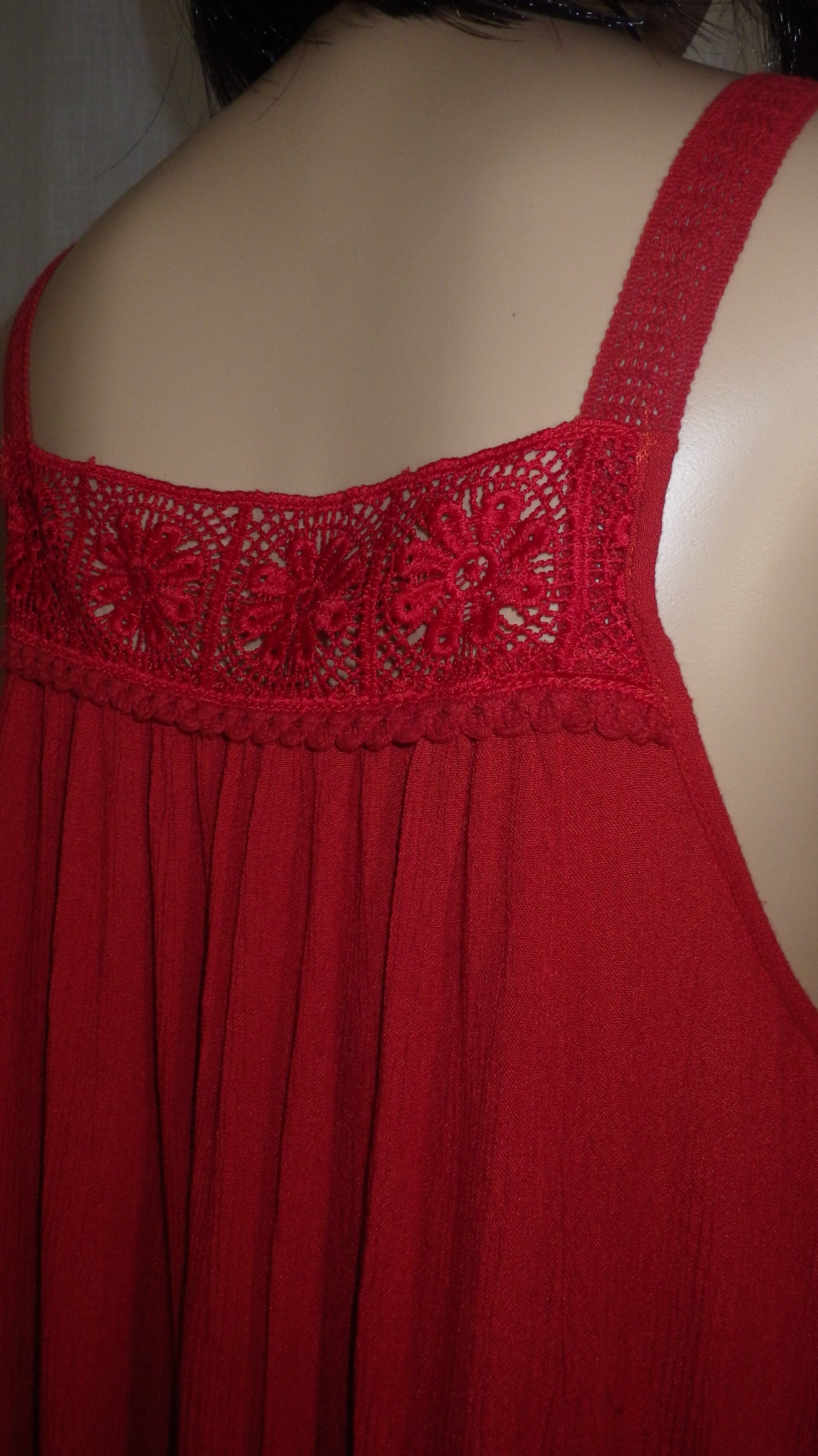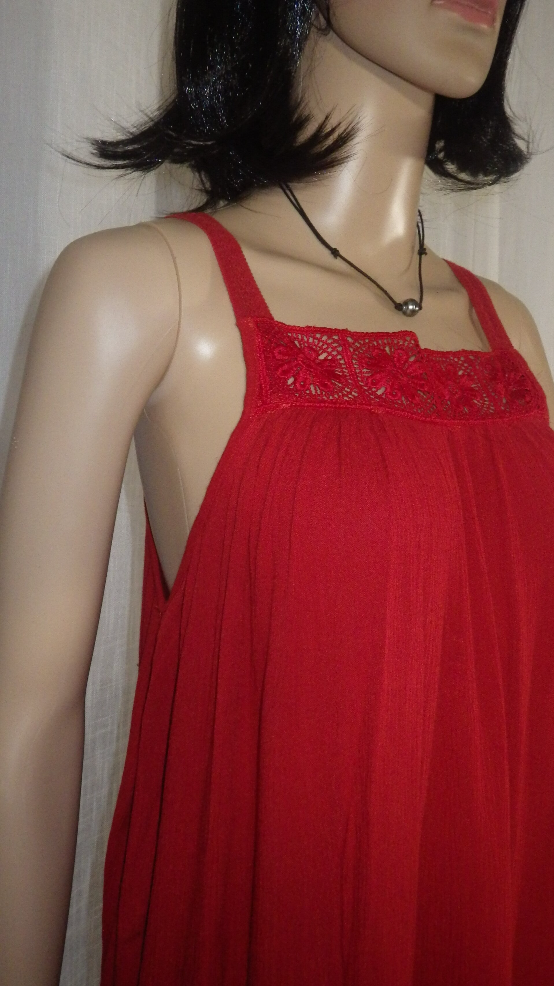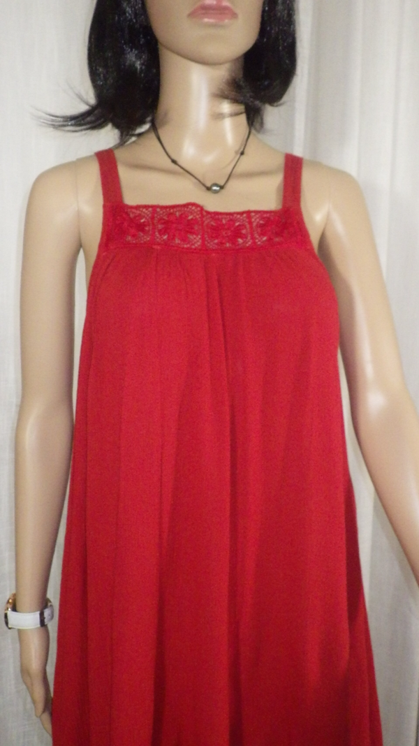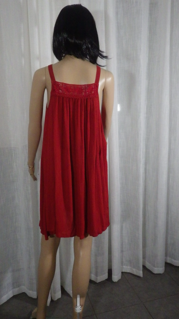 Robe courte en Crépon ornée de dentelle tout autour du buste et bretelles rouge foncé