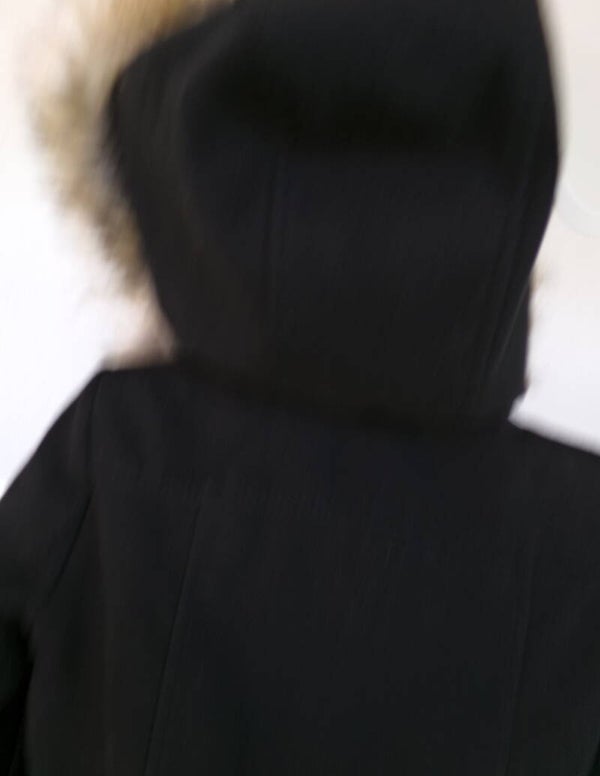 Manteau Tissus Noir avec capuche ornée de moumoute, possibilité d'enlever la capuche sur manteau fixée avec boutons