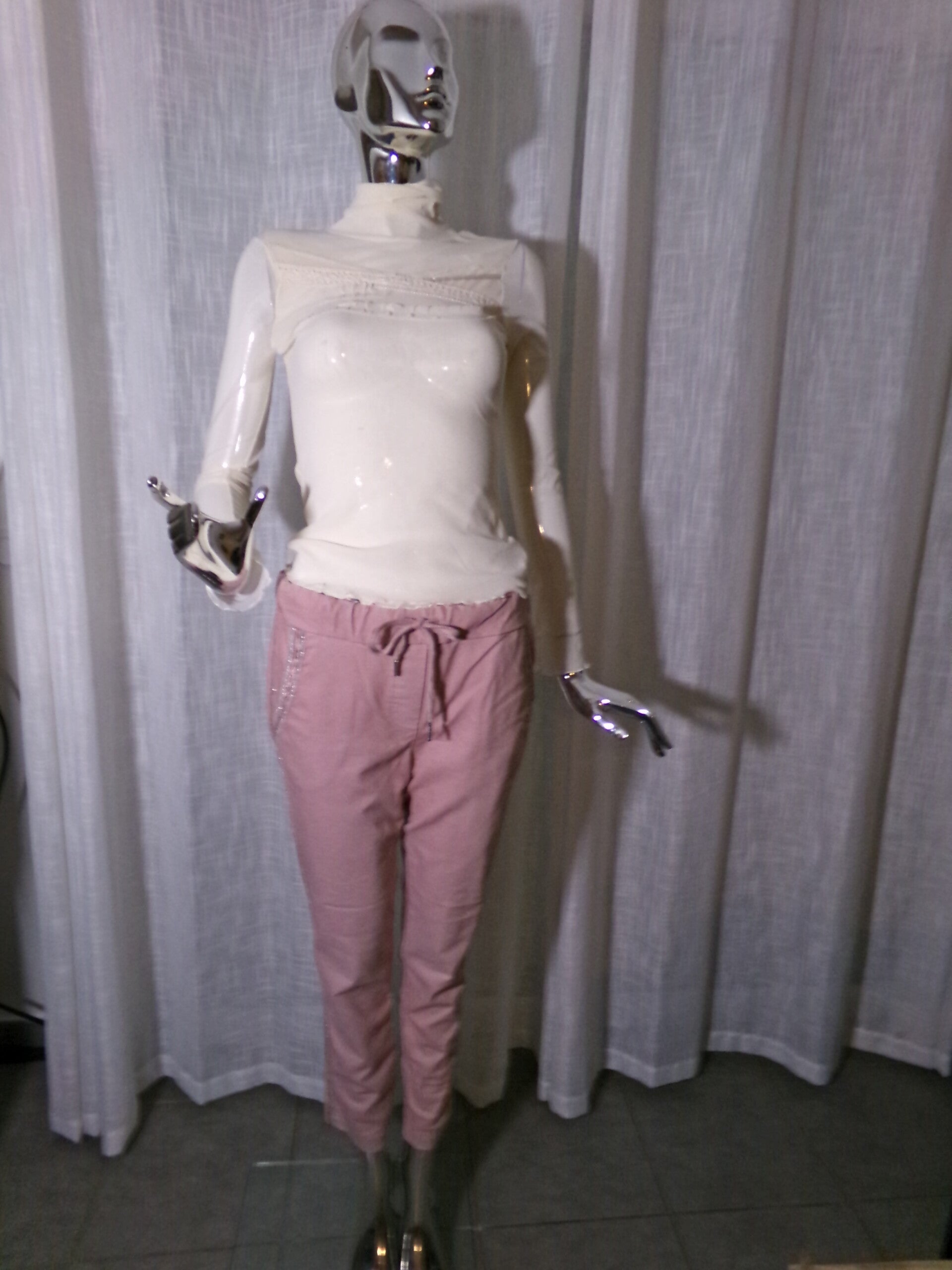 Pantalon Rose Pale très stylé avec bandes élégantes argent et rose sur les côté fermeture cordon