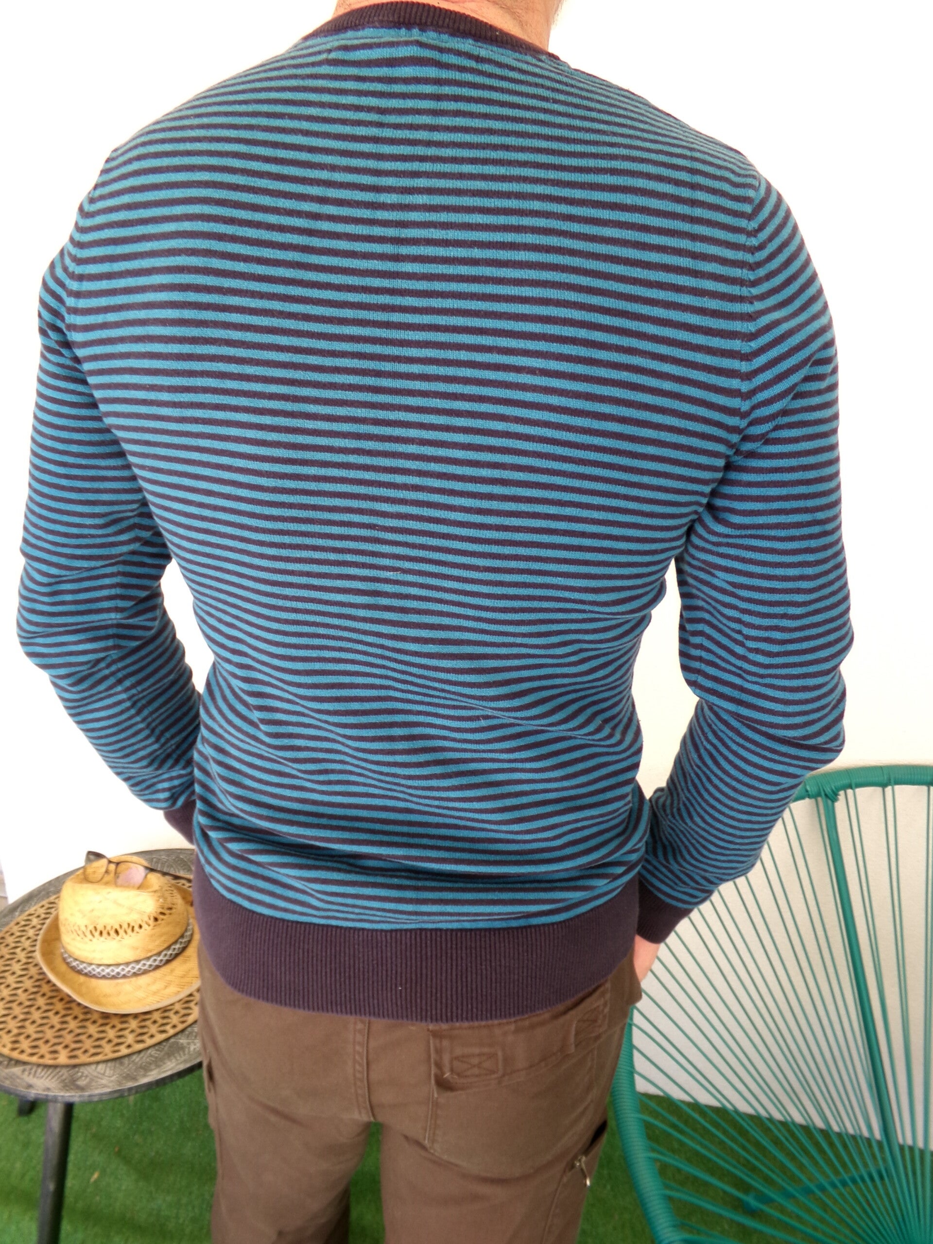 Pull Col en V à lignes Bleu turquoise et bleu marine Taille M
