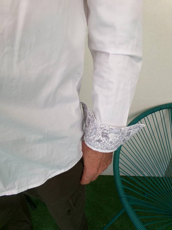 Chemise manches longues ornées de motifs bleu ciel sur revers des manches et intérieur col, coupe droite