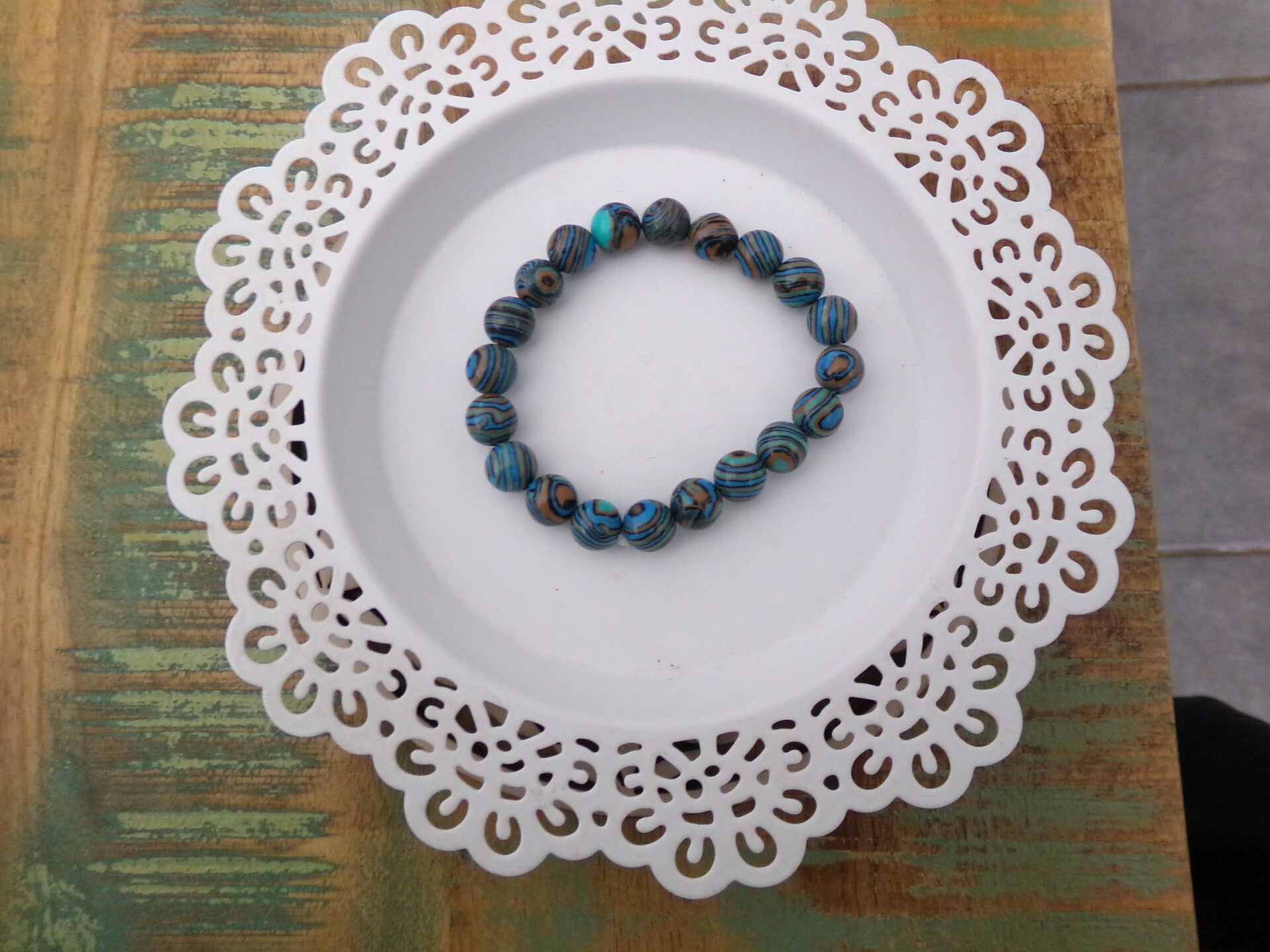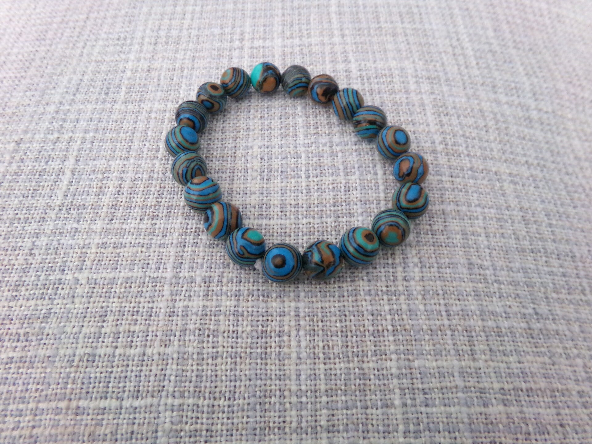 La turquoise africaine est une variété de turquoise avec des nuances vertes et bleues. Un bracelet en perles de turquoise africaine avec des rayures orange et verte, magnifique.