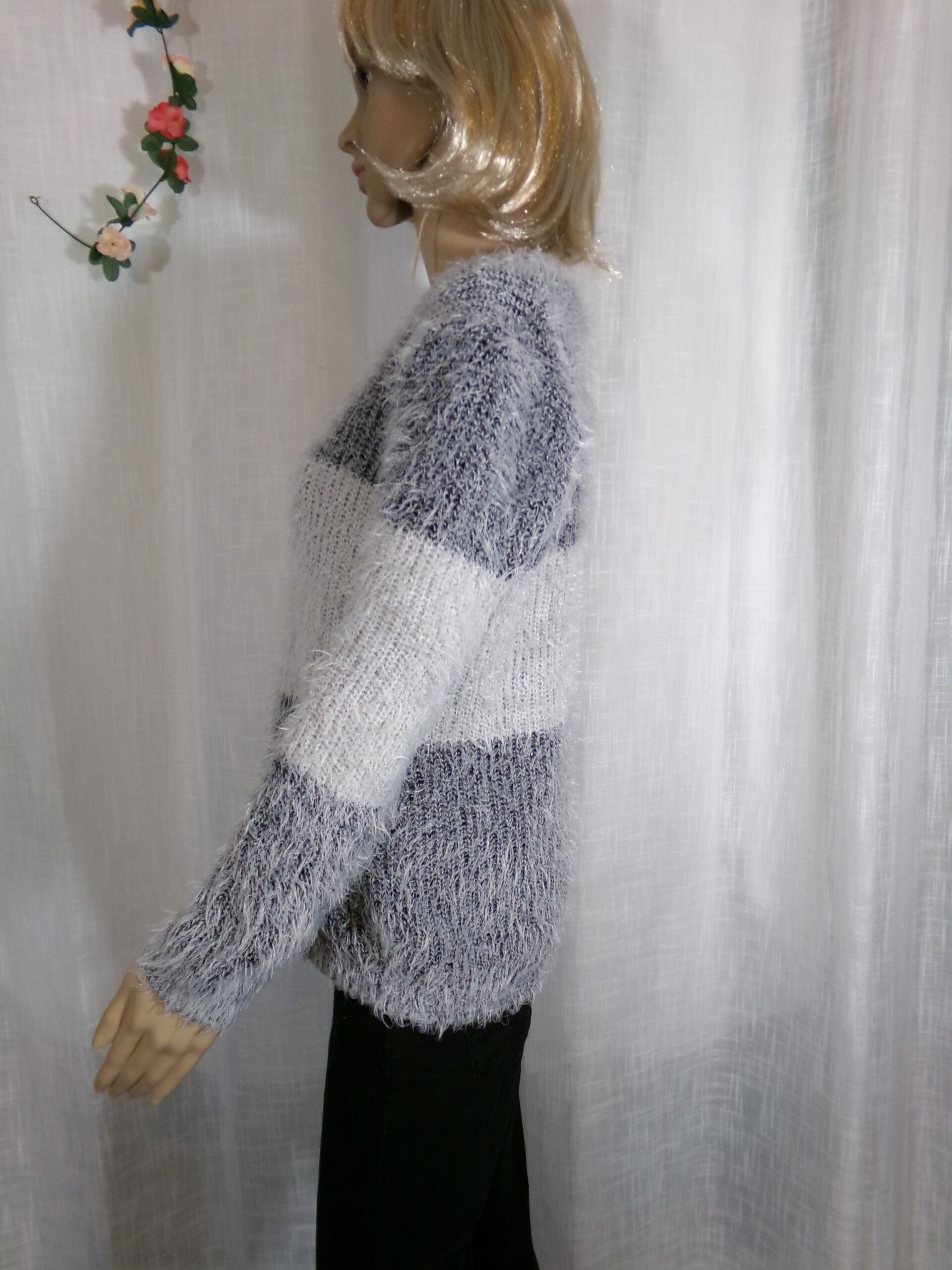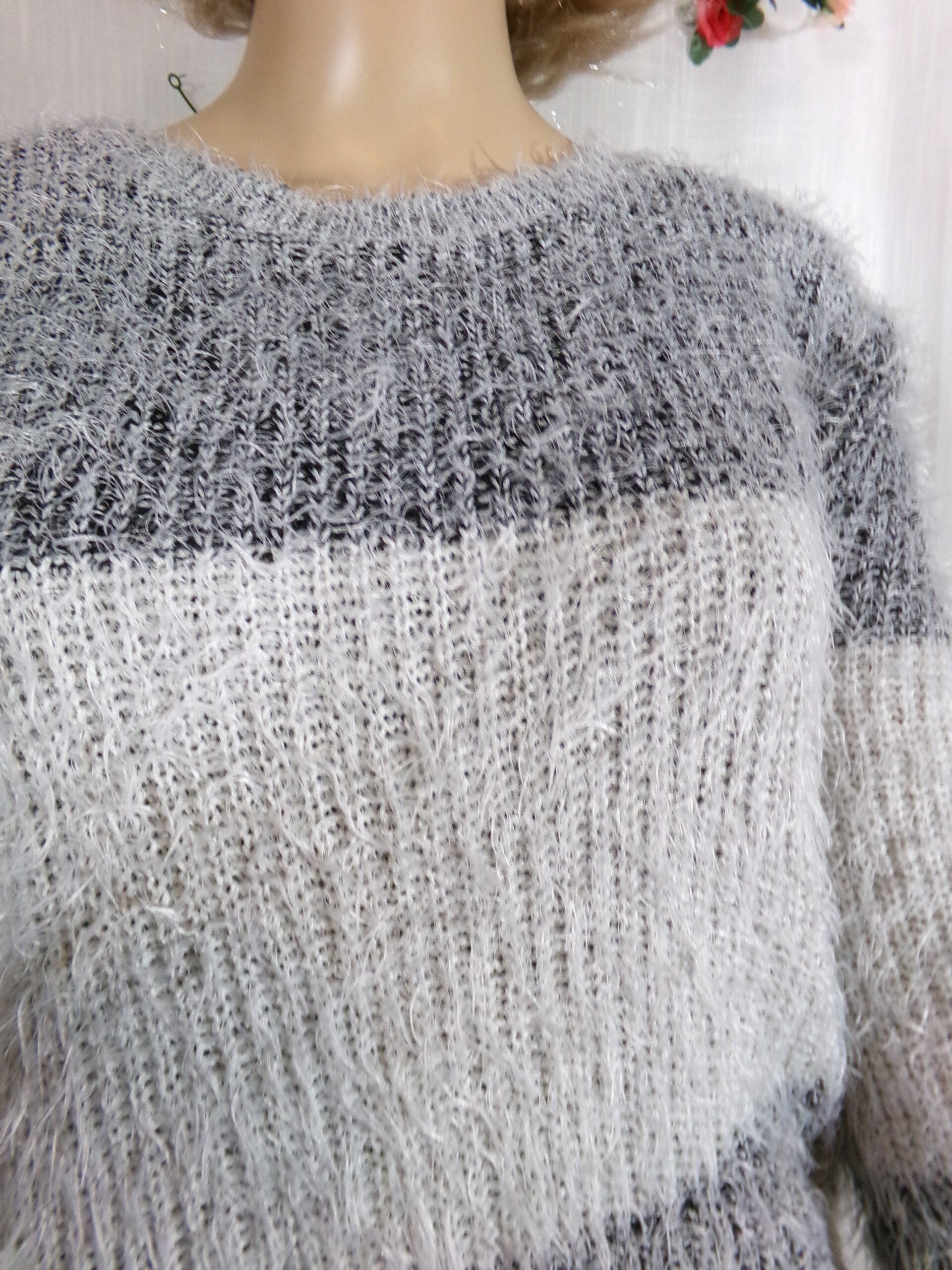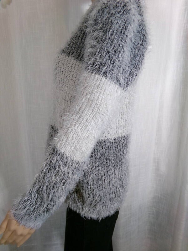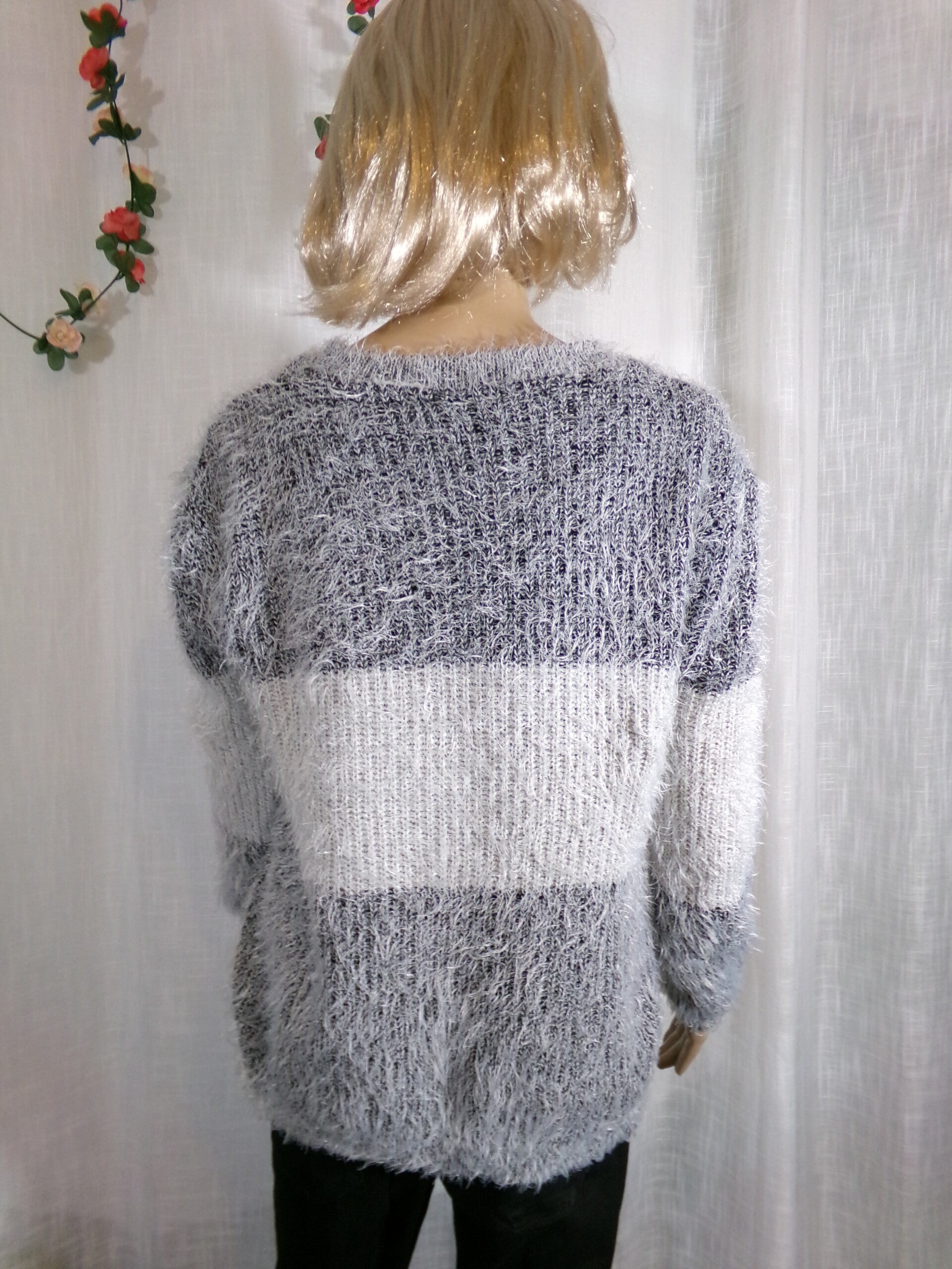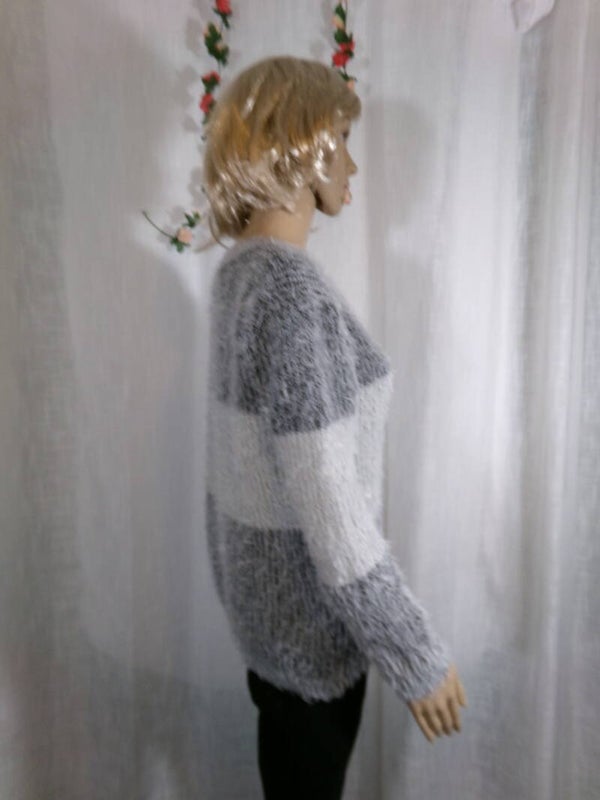 Pull moumouté gris et blanc à col rond, léger, et très confortable.