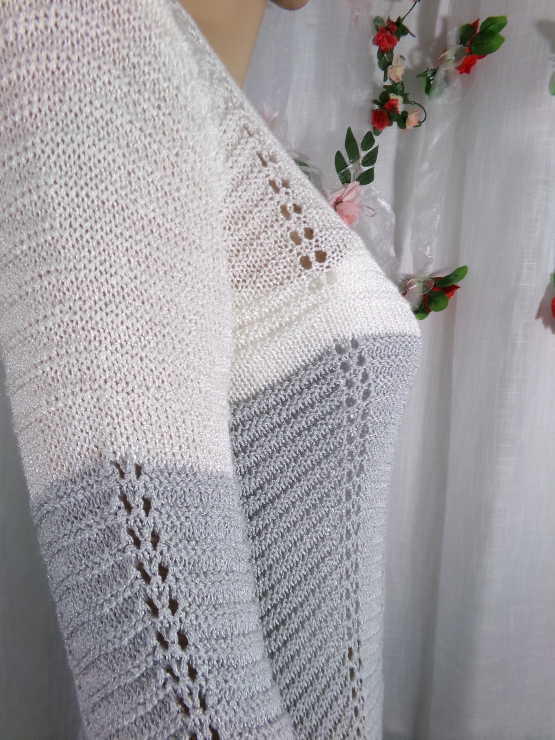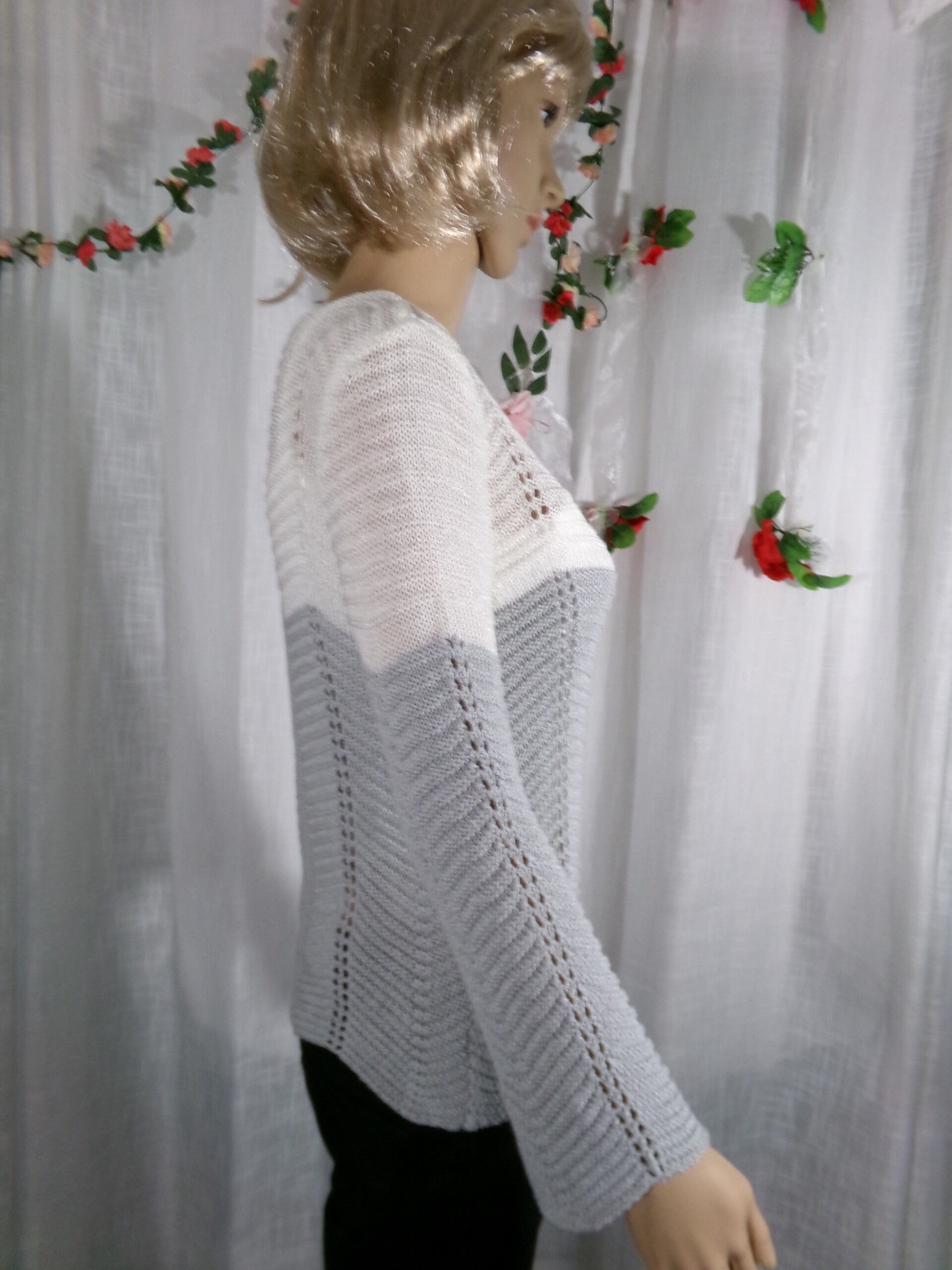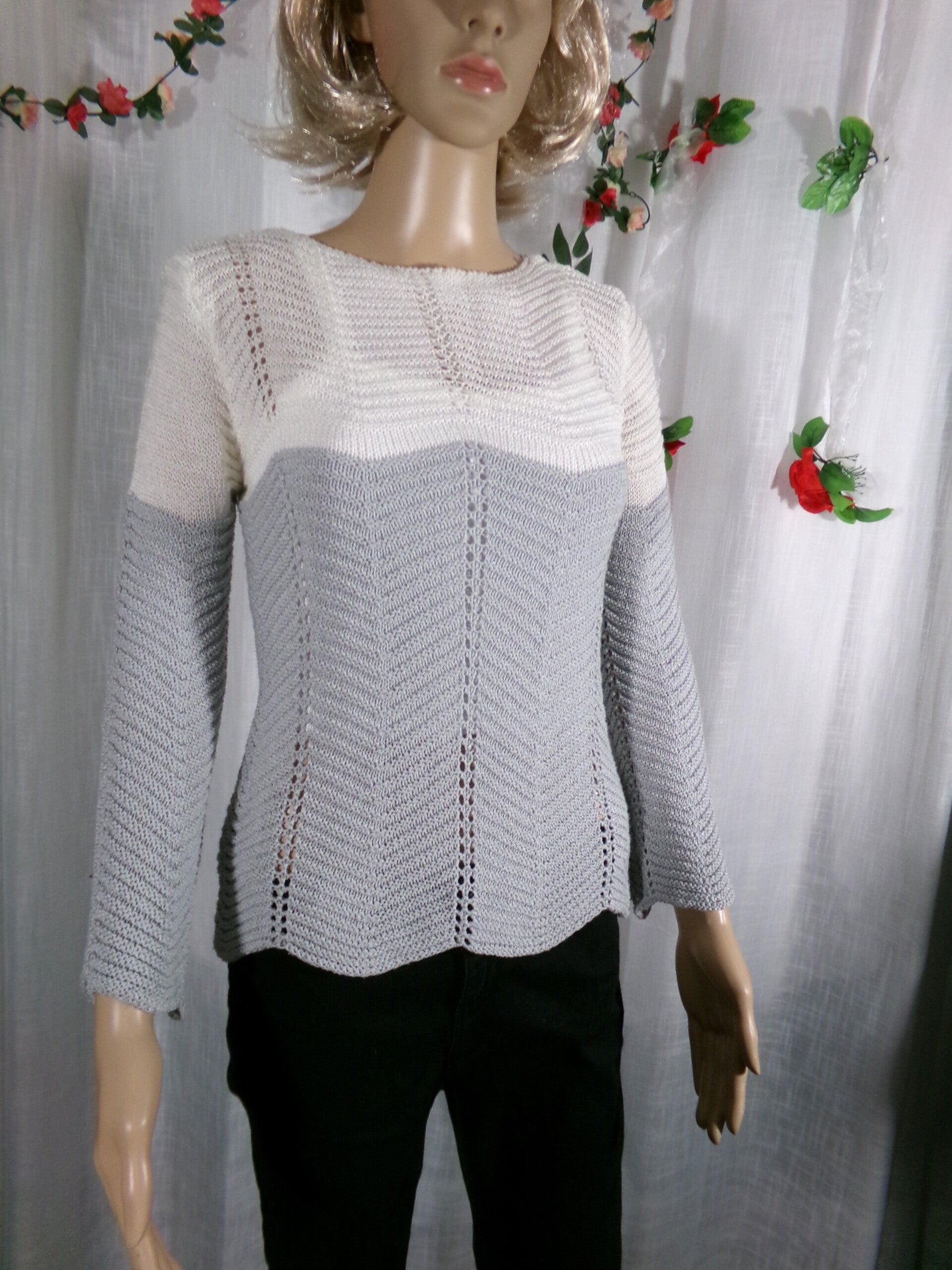 Pull crocheté Blanc et Gris manches longues, très fin, et très original, agréable à porter !