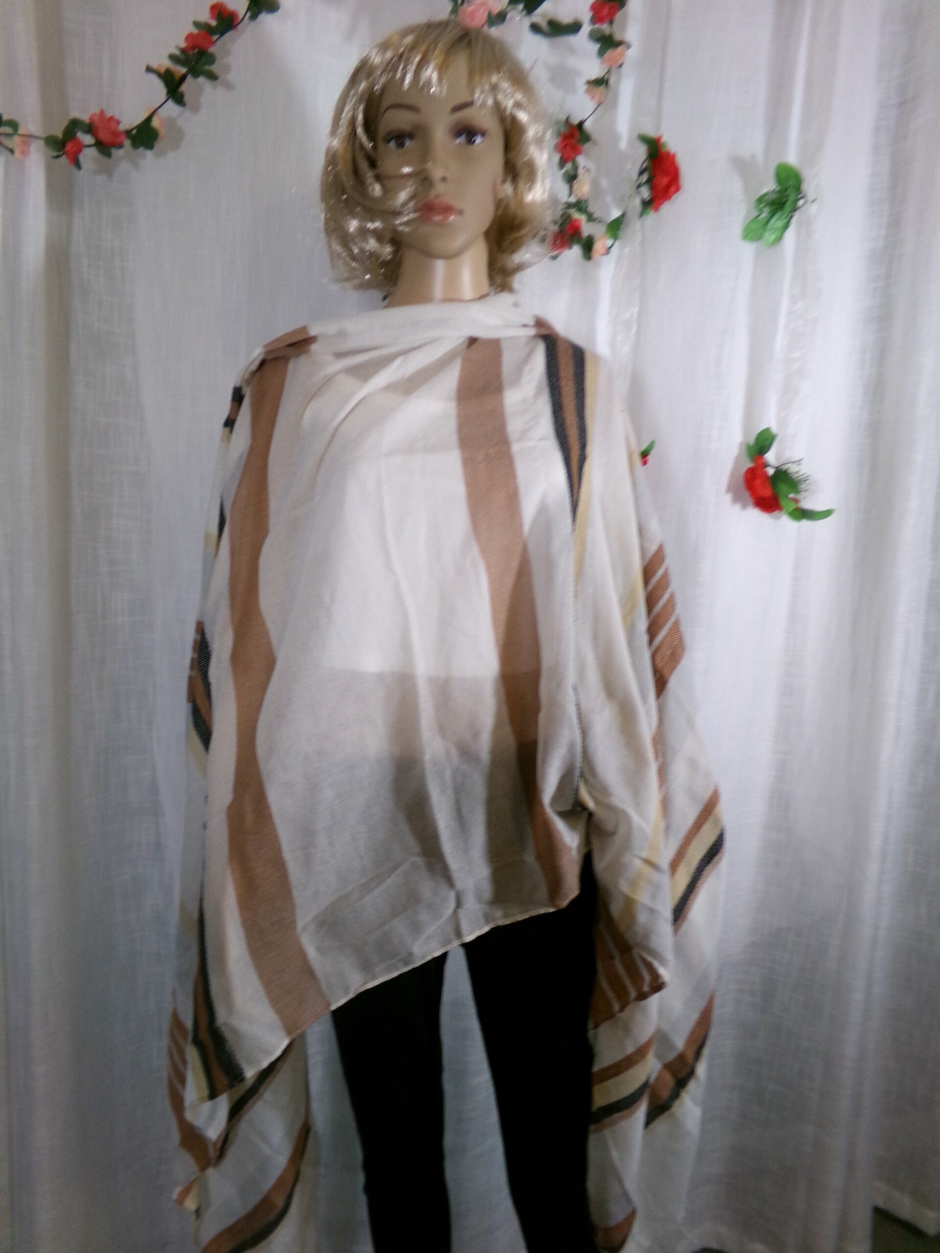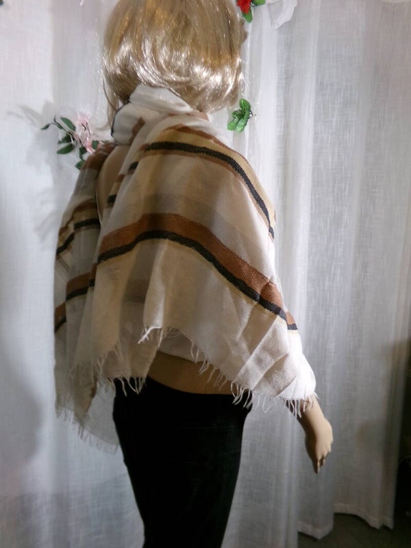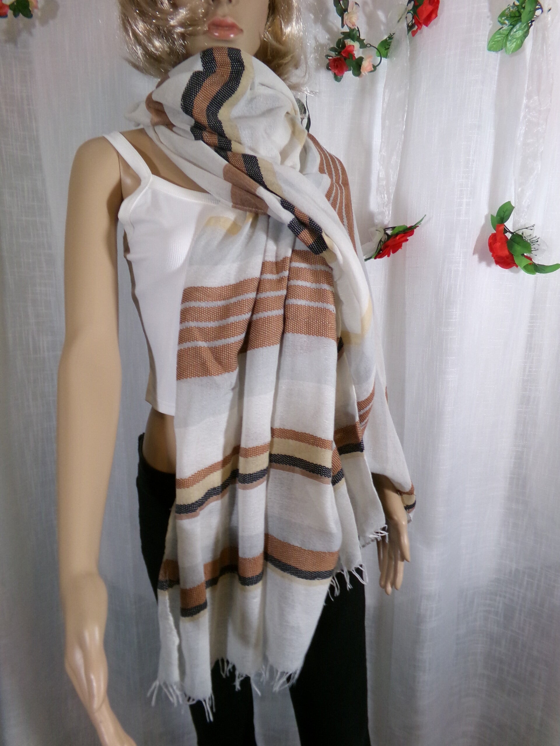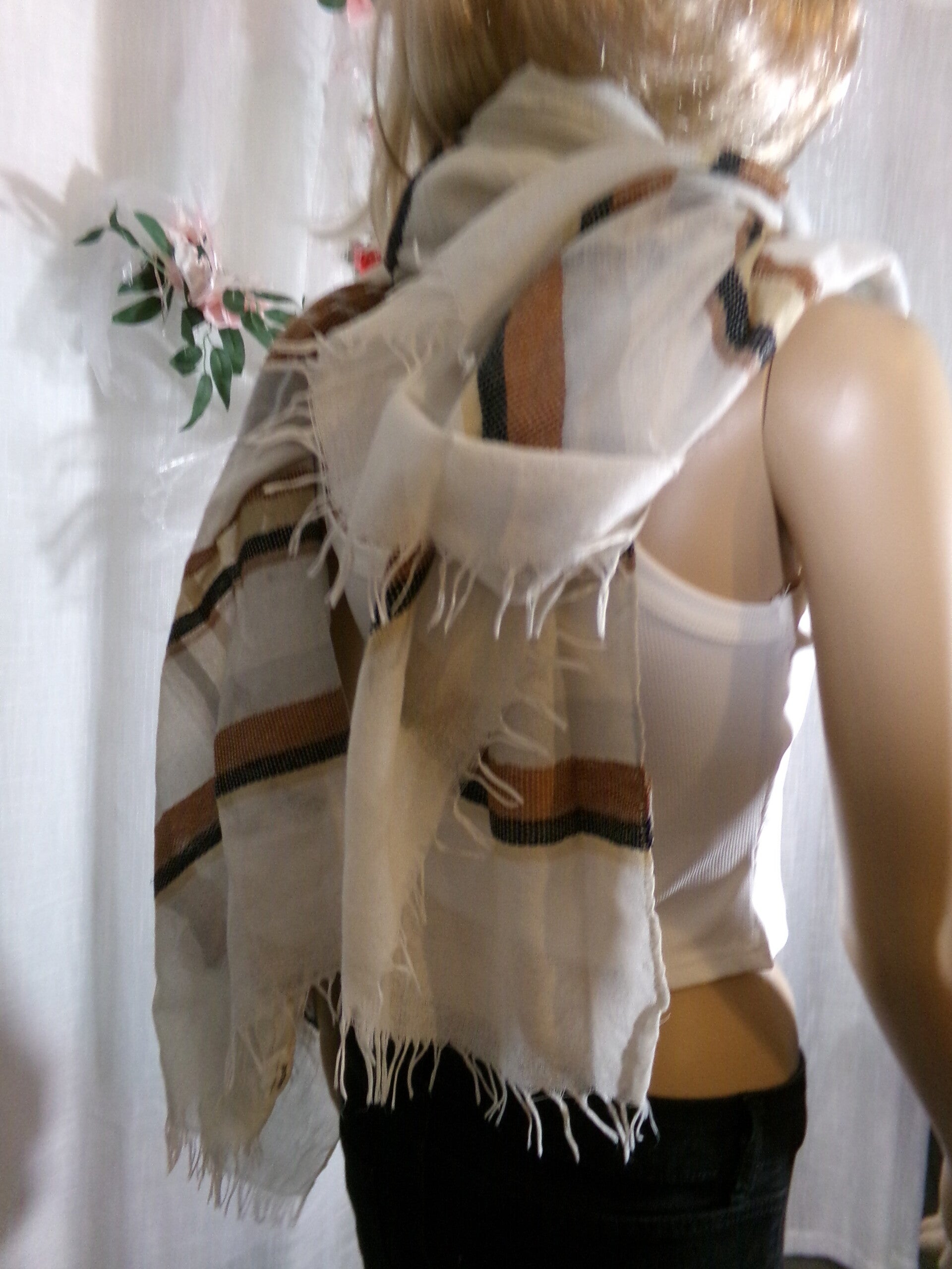 Echarpe rectangle longue Couleurs dominante Blanc avec ligne tons marron noir gris jaune, très raffinée !