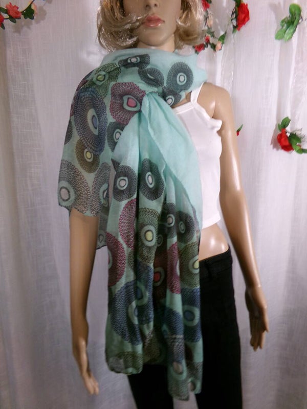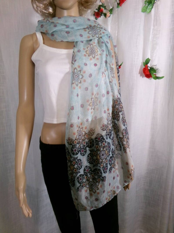 Foulard rectangle bleu turquoise, voilage de qualité, motifs magnifiques !