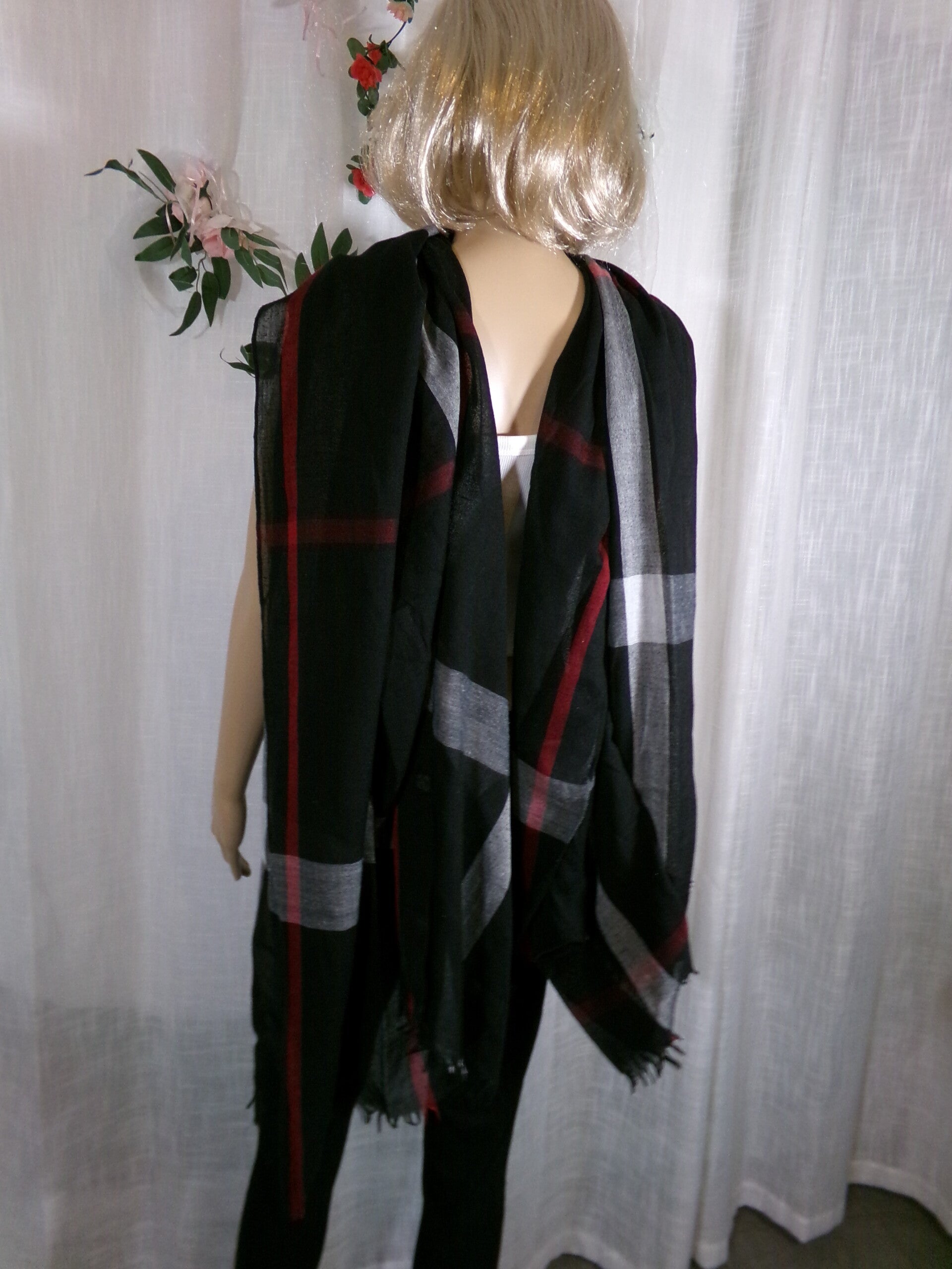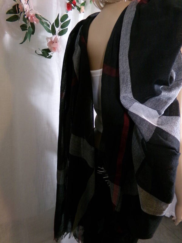 Grande écharpe rectangle noir gris blanc rouge très subtile, et très jolie, avec petites franges noir qui lui donne son charme.