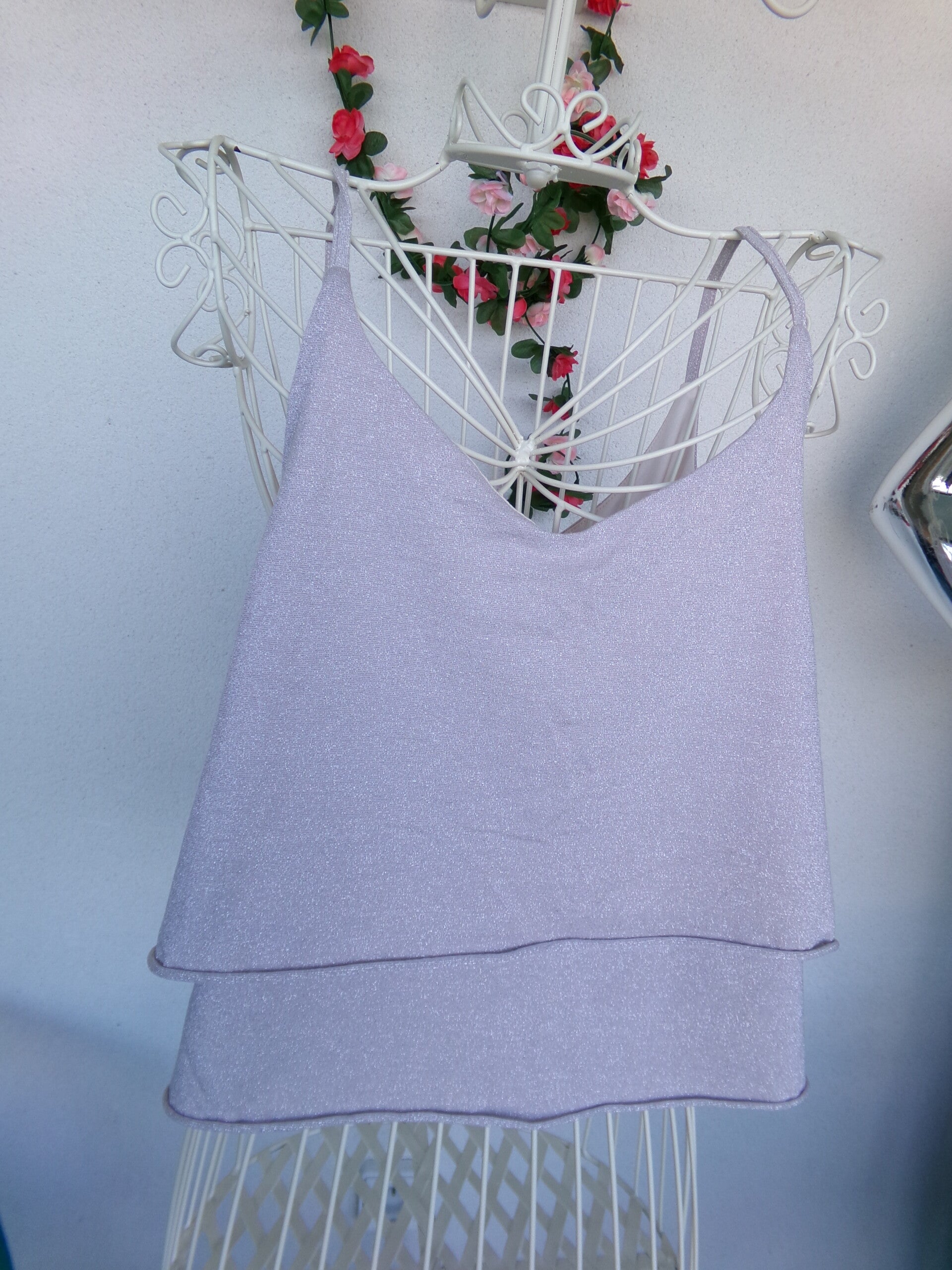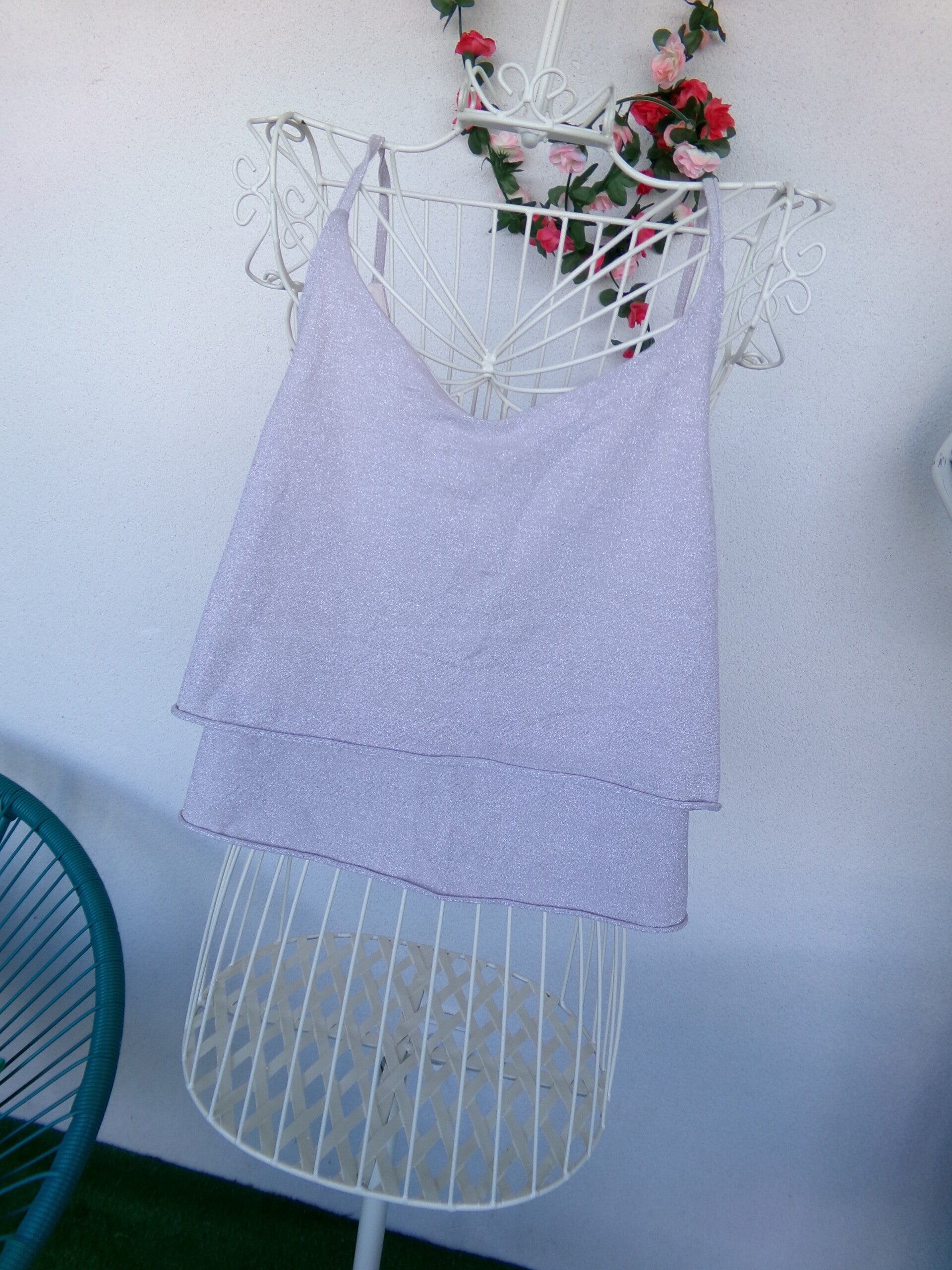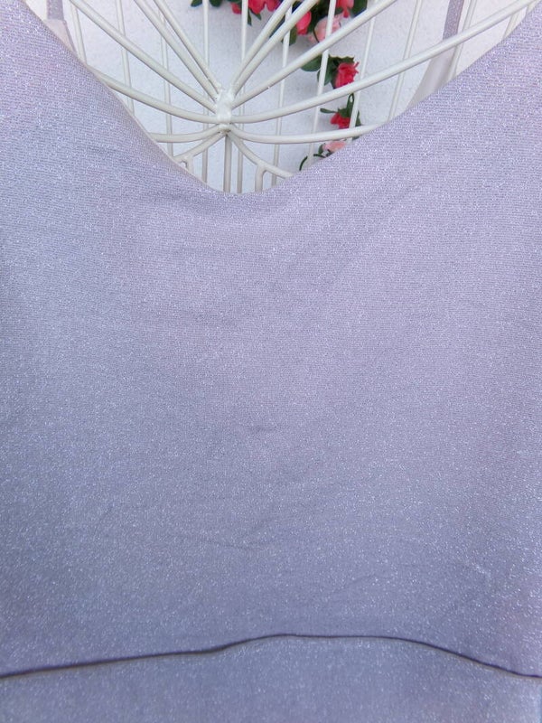 Haut court à bretelle Champagne à paillettes très fines Collection PIMKIE, légerement en V devant.