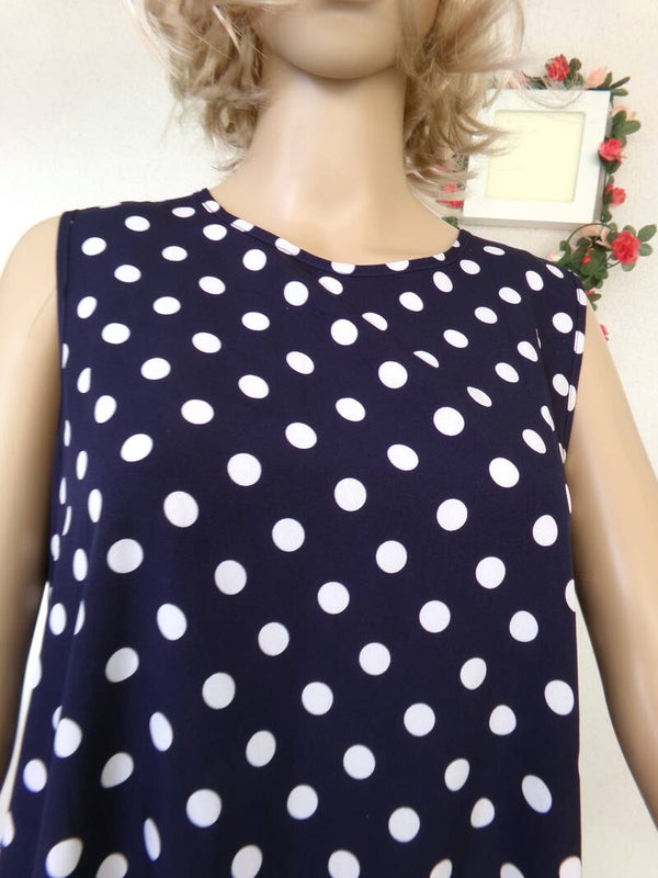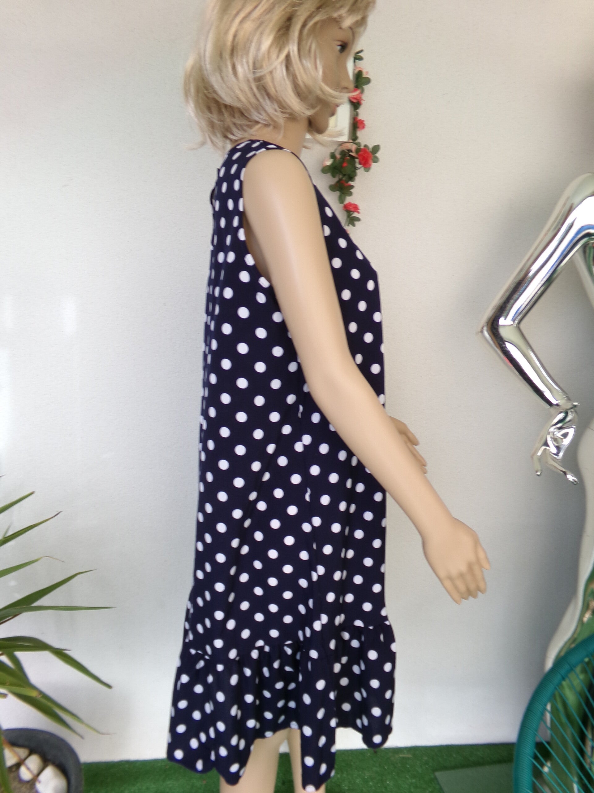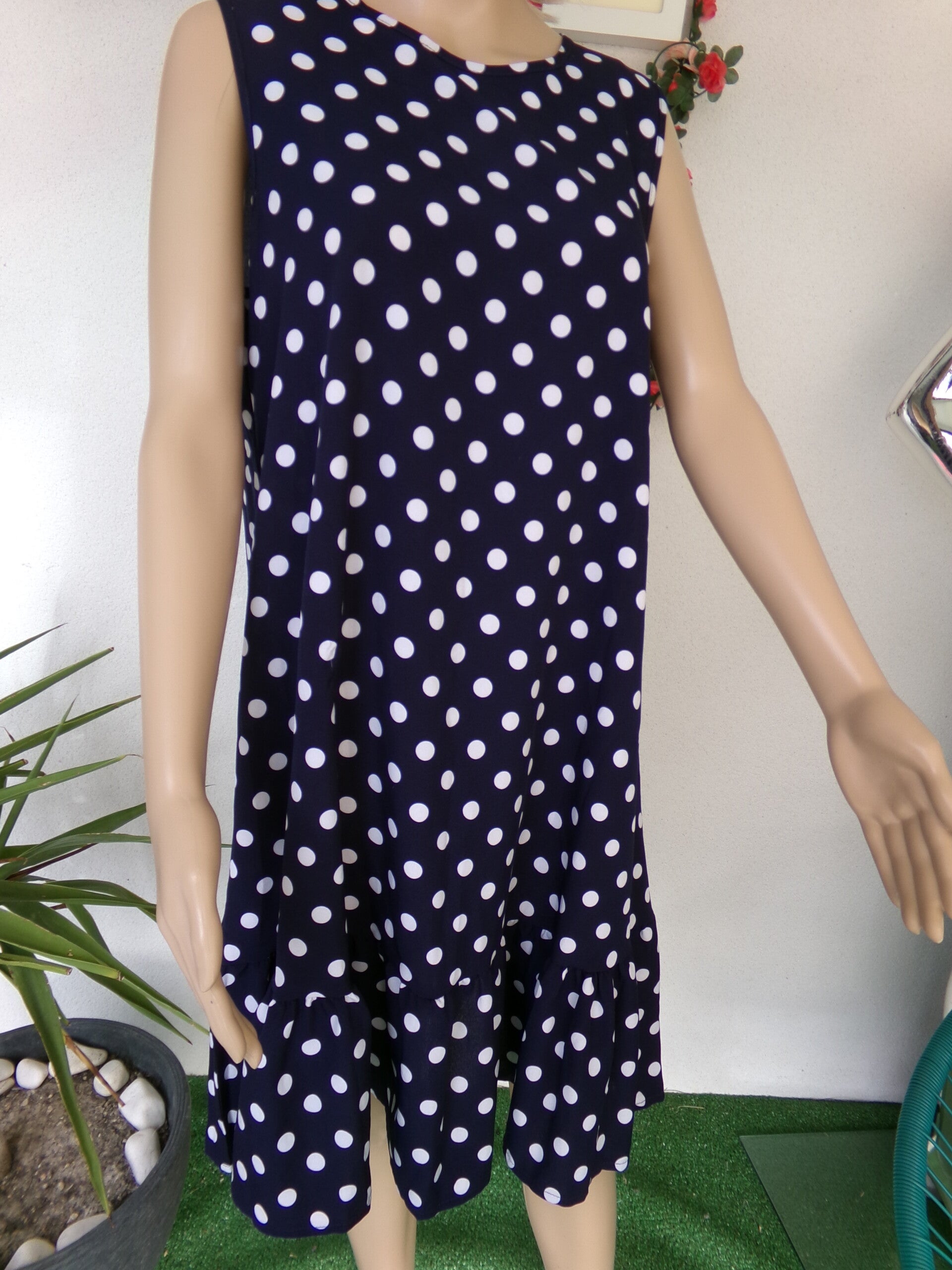 Robe Bleu Marine à poids blancs évasée, ras de cou, volants en bas, fermeture déclicate avec petit bouton, légère et très jolie !