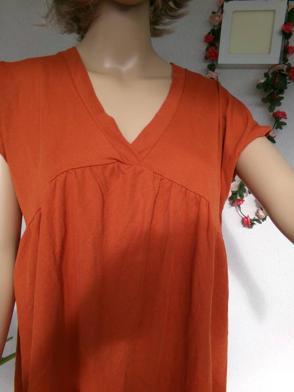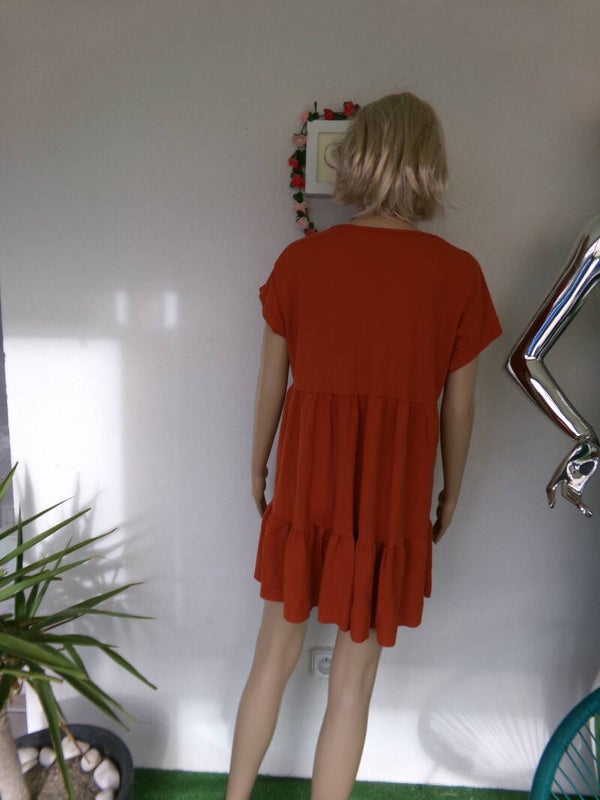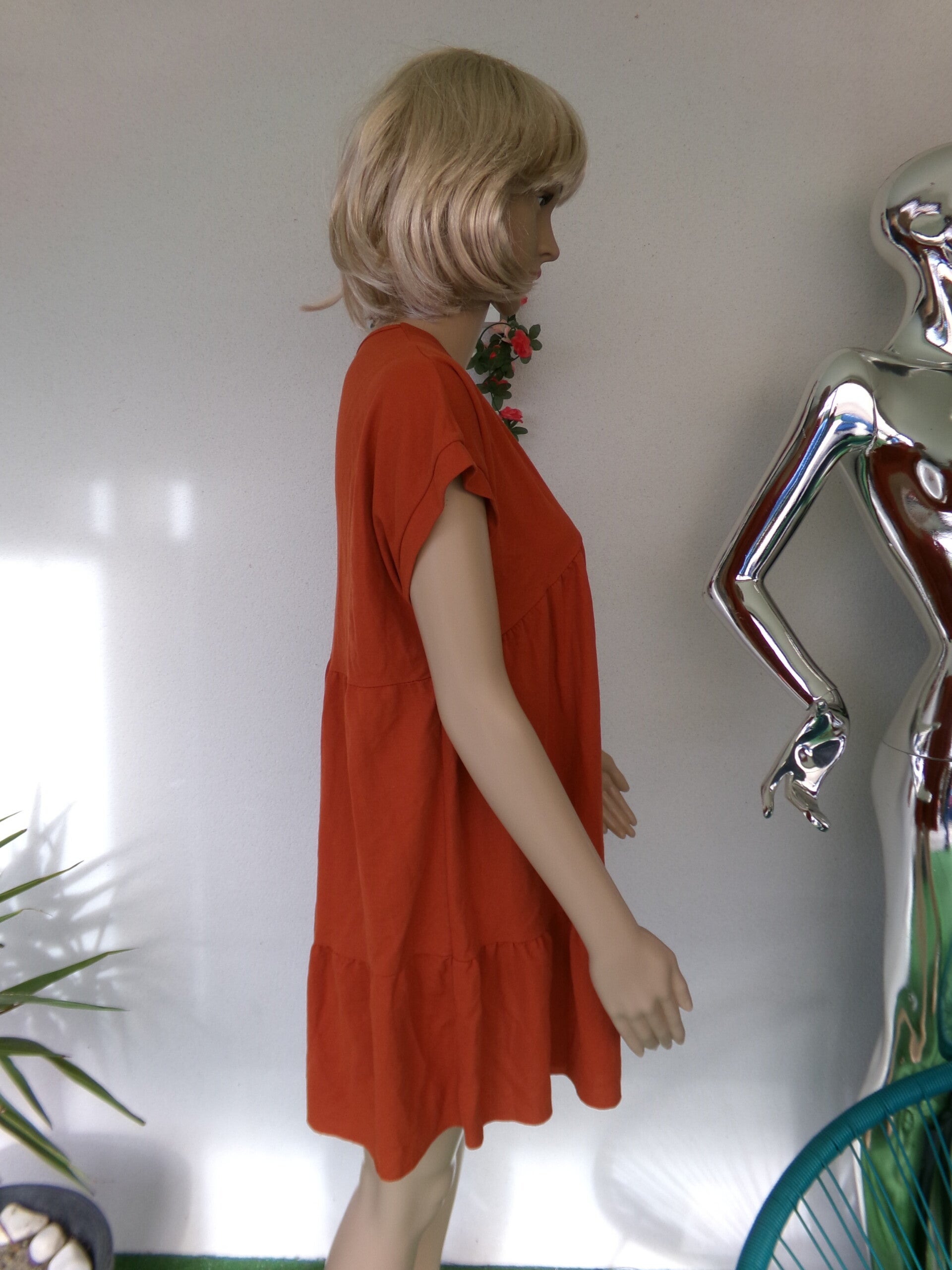 Très joli Robe d'un orange éclatant, col en V, volanté dans le bas, coupe évasée, manches courtes, vous allez être adorable dans ce petit bijou à l'état pur, rayonnant de soleil et de simplicité, et originale à la fois !