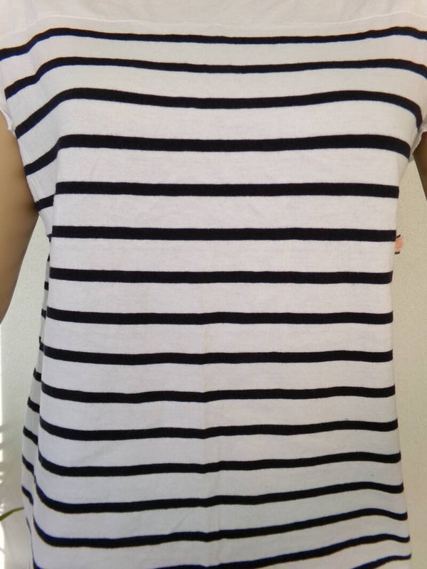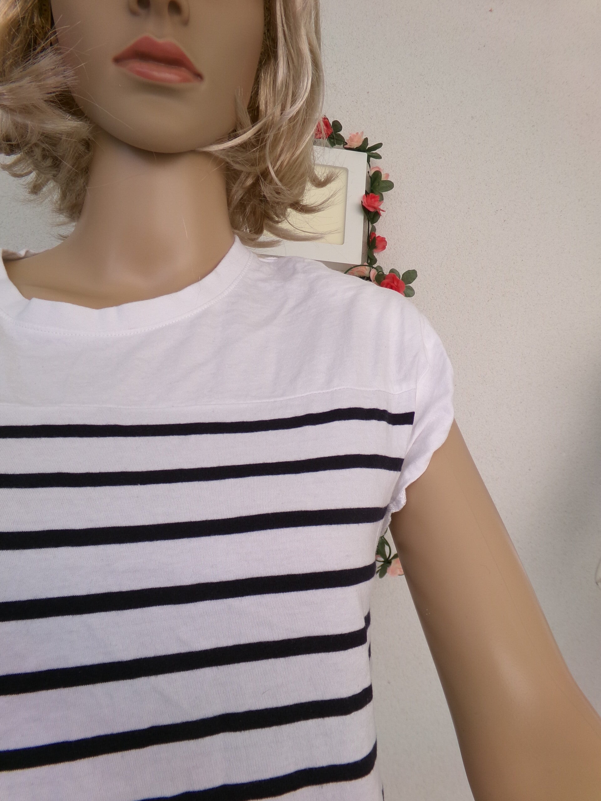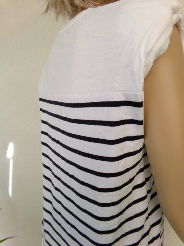 Tee Shirt Marin avec épaulette, qui lui donne son originalité énégalable, ligne bleu marine et blanc.