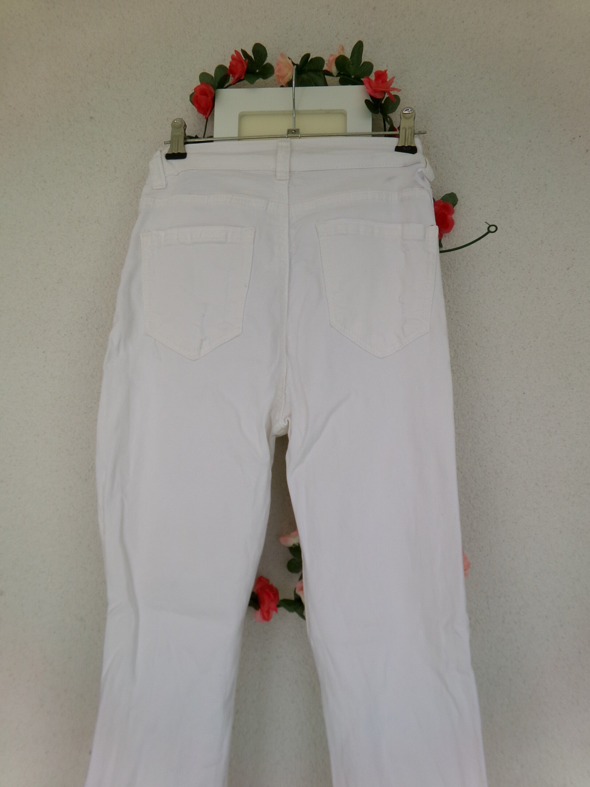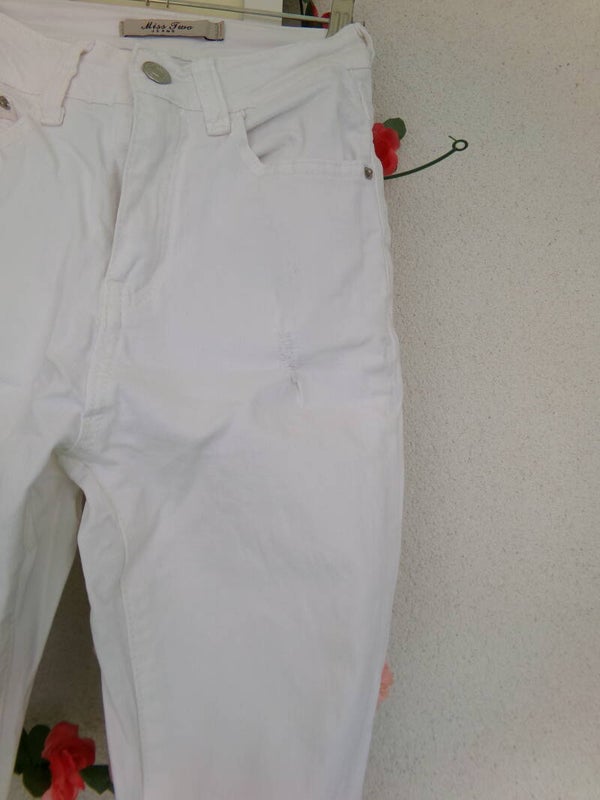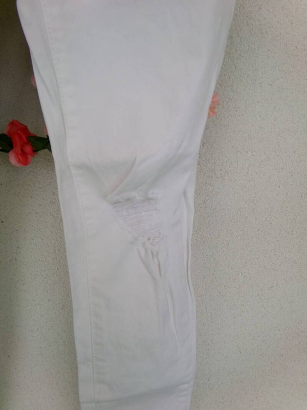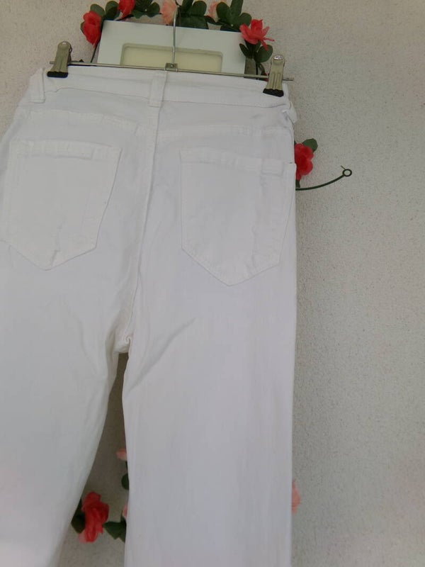 Jean Blanc extensible troué d'une beauté éclatante, non transparence, très bonne qualité, fermeture et bouton.