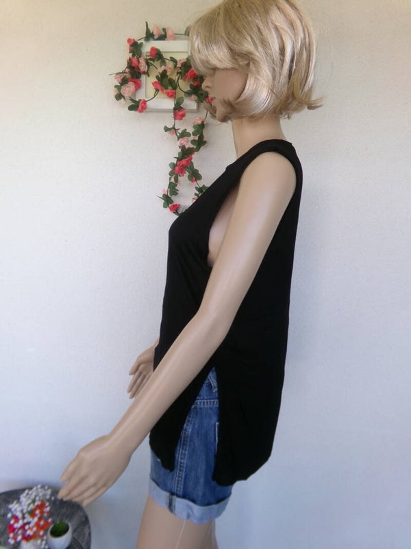 Haut sans manche, matière tee shirt, fendu des deux côtés, sa forme apporte une harmonie de porté de plusieurs façons, génialissime !