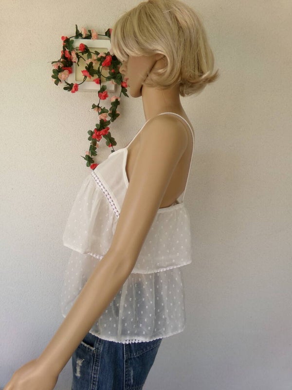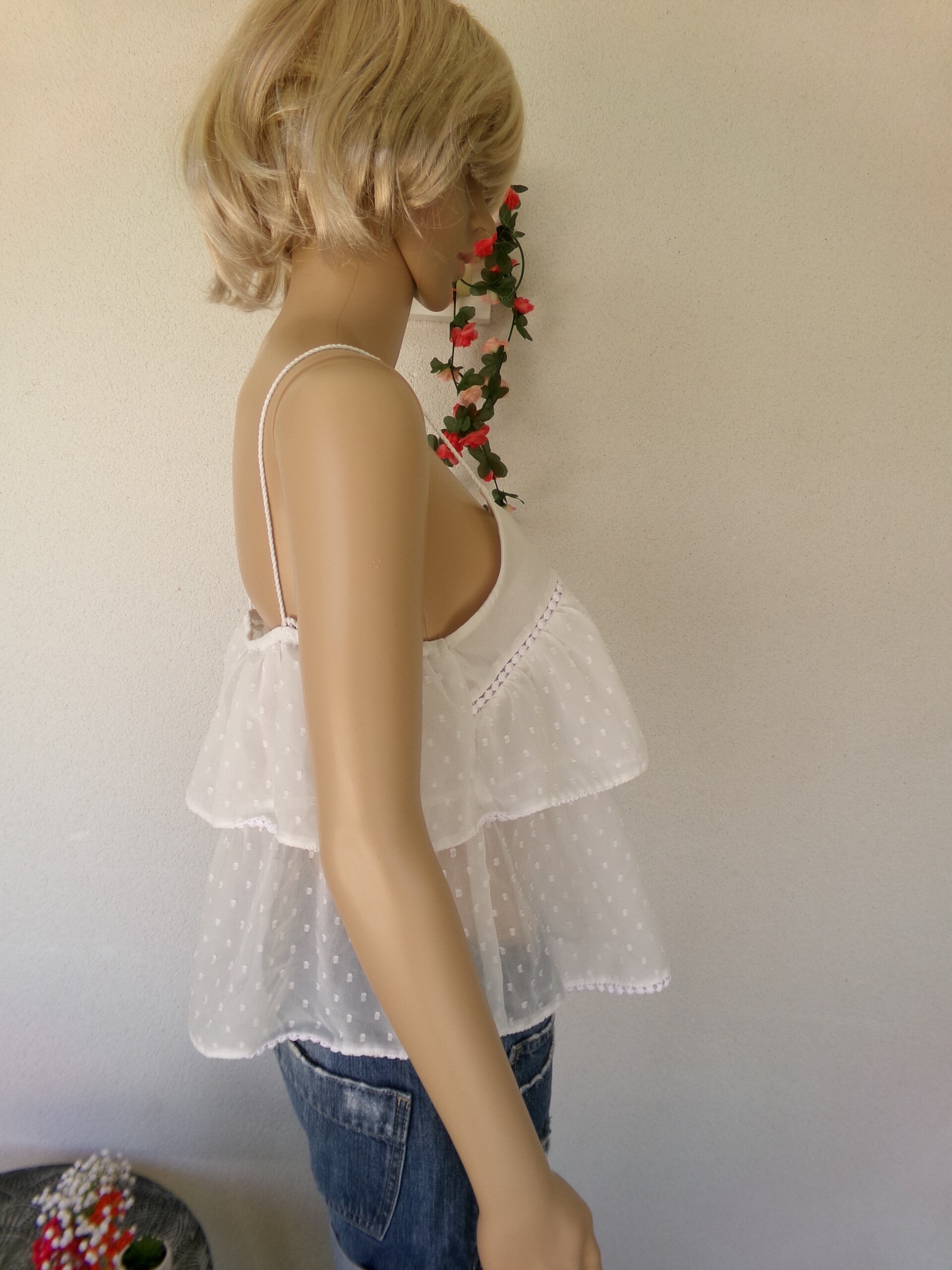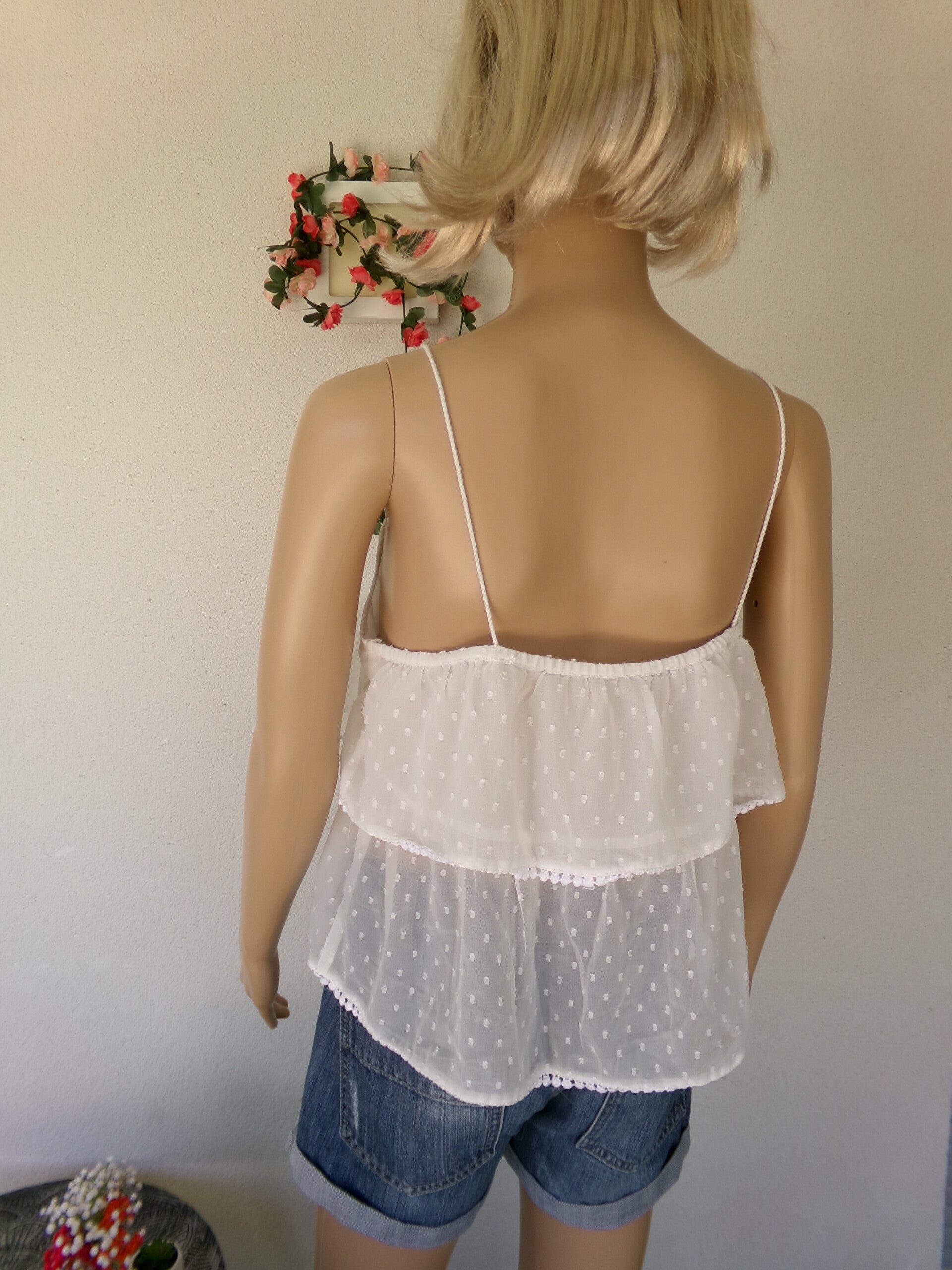 Haut à fines bretelles, à double volants motif en relief, blanc Taille 36/38