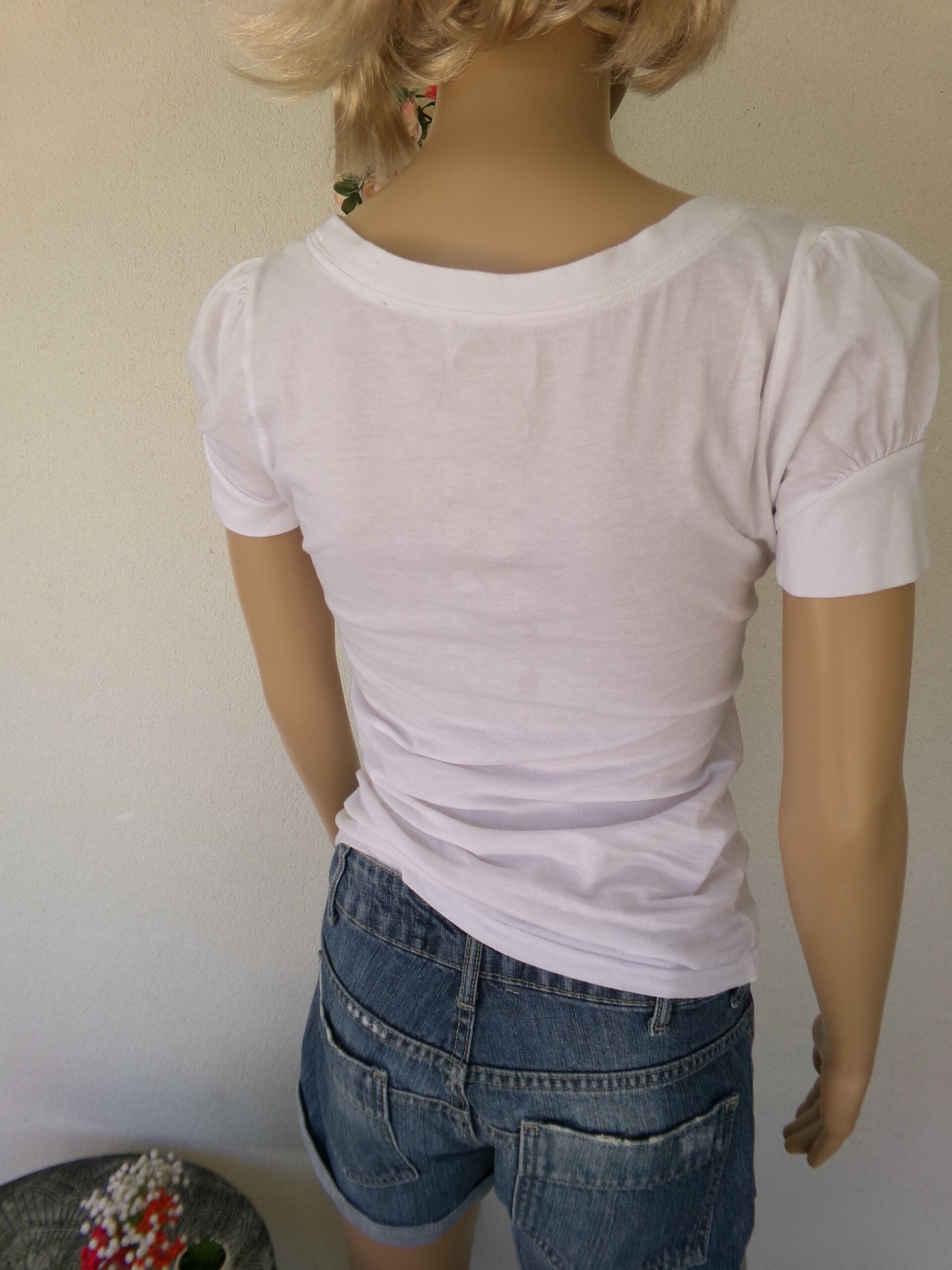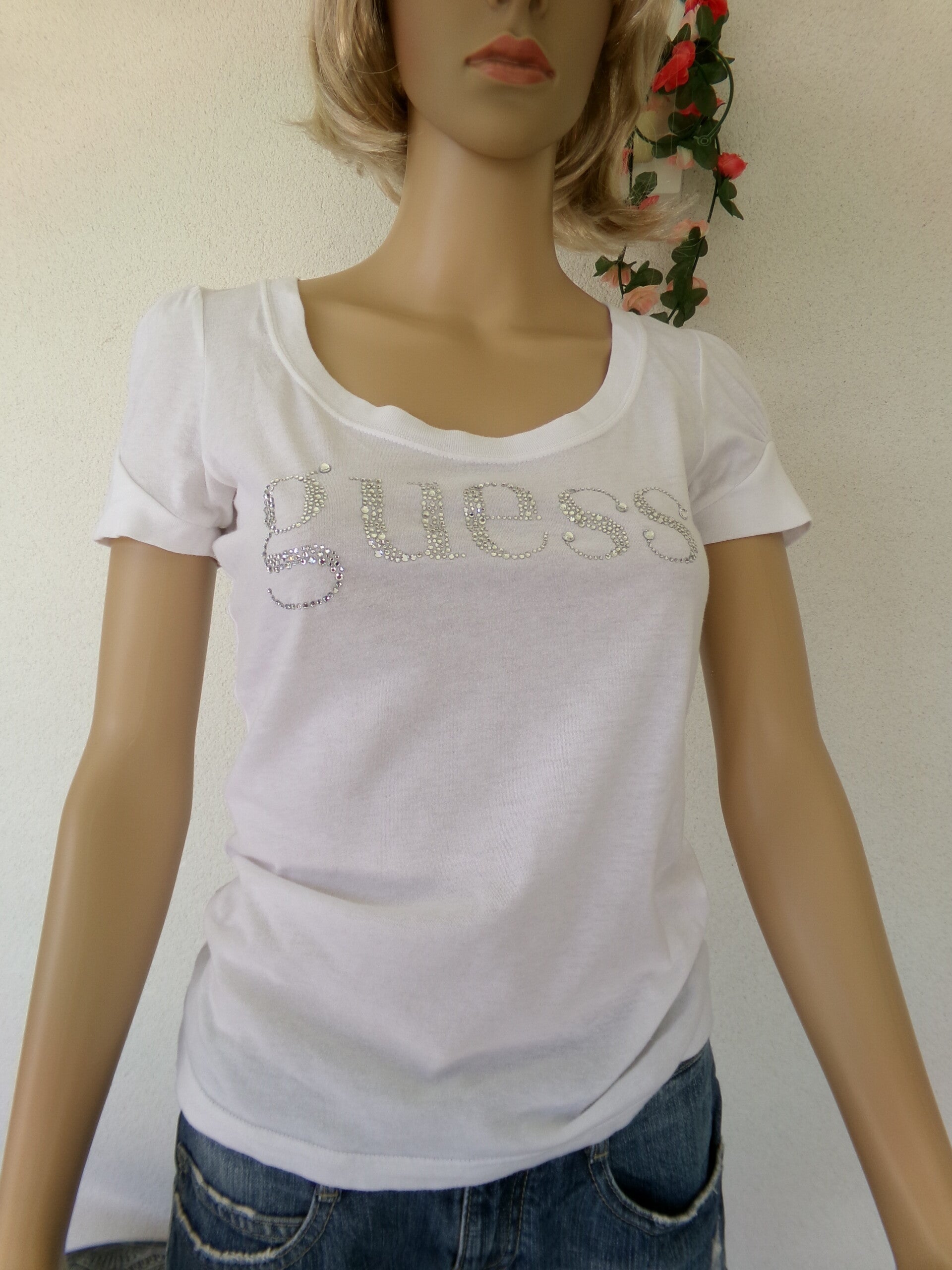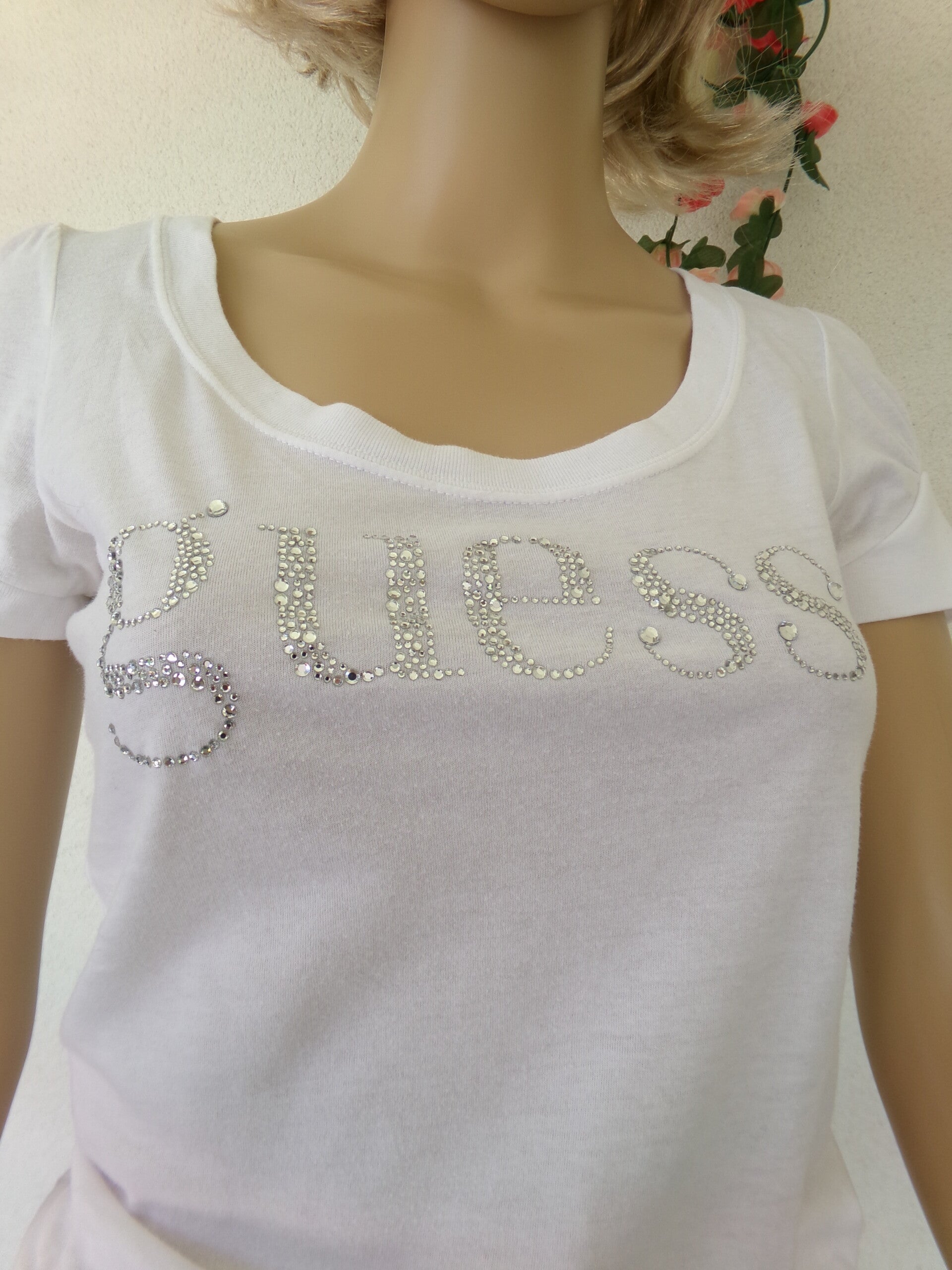 Tee Shirt Blanc GUESS, motif devant en perles GUESS argent.
