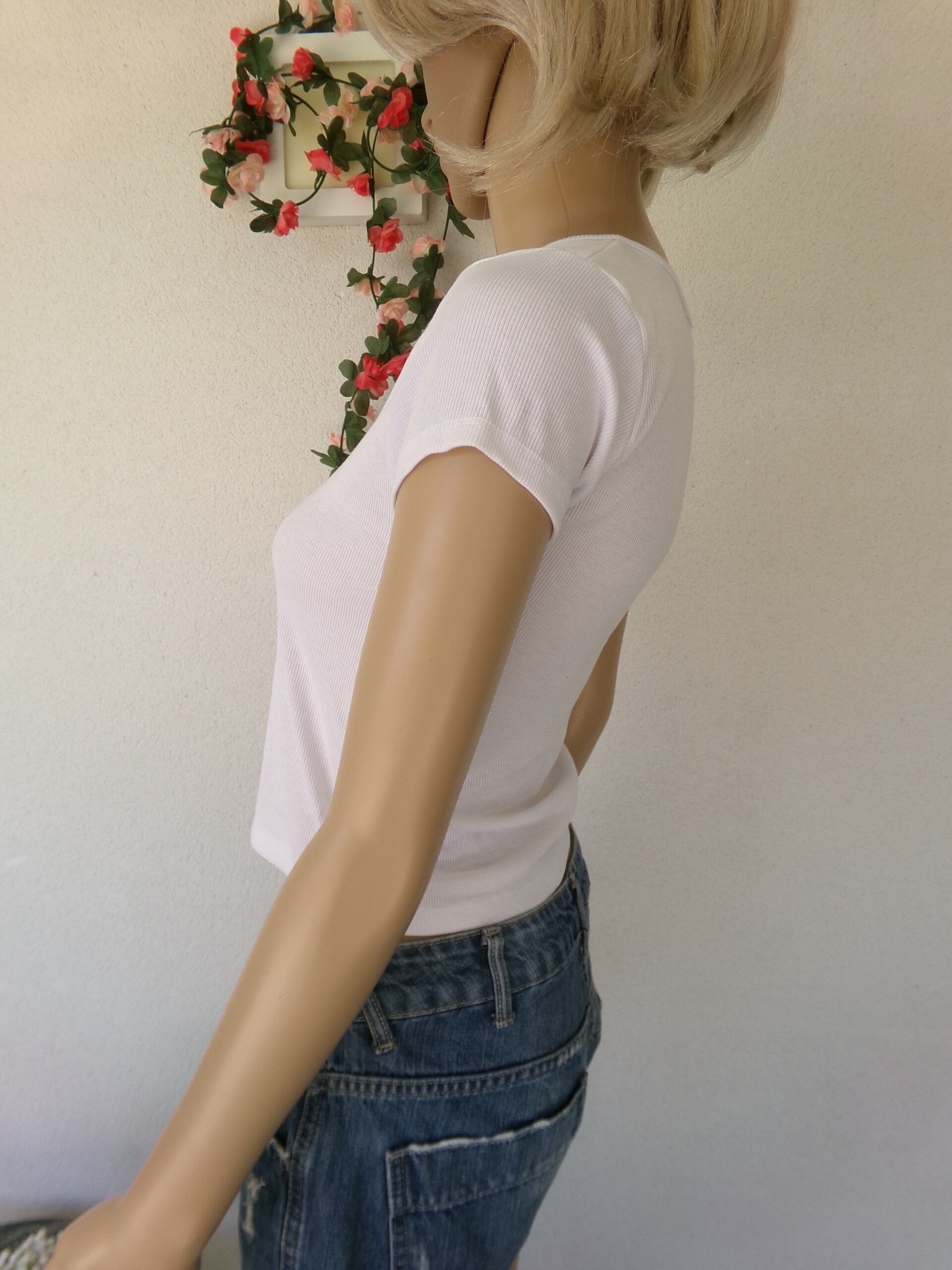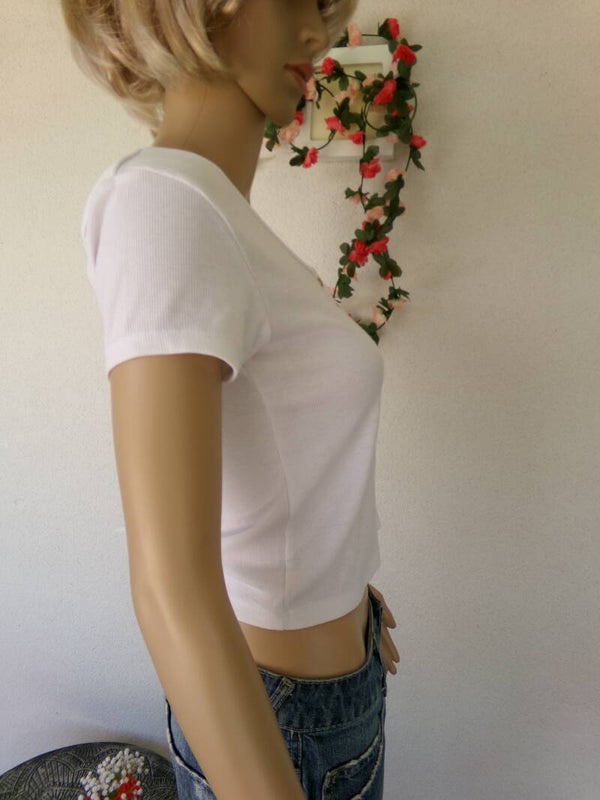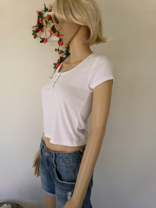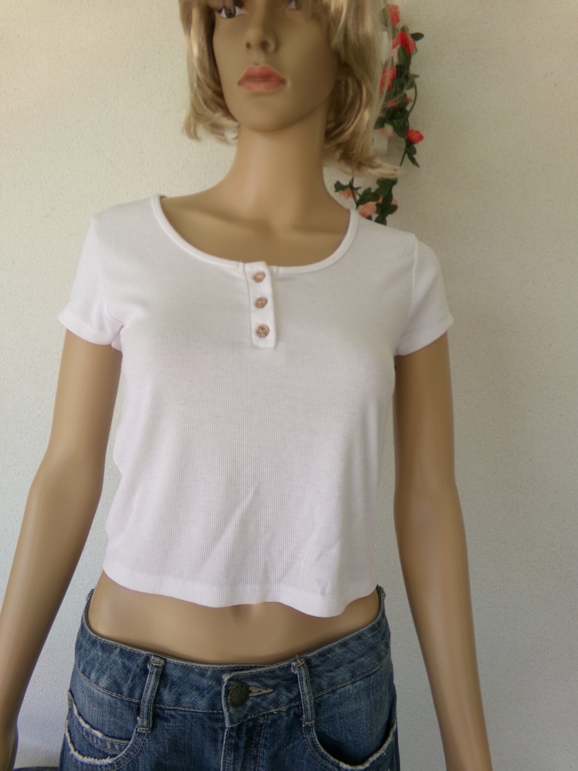 Tee Shirt court côtelé, fermeture à boutons, côtelé, très bonne qualité, ne se déforme pas, il est joli à souhait !