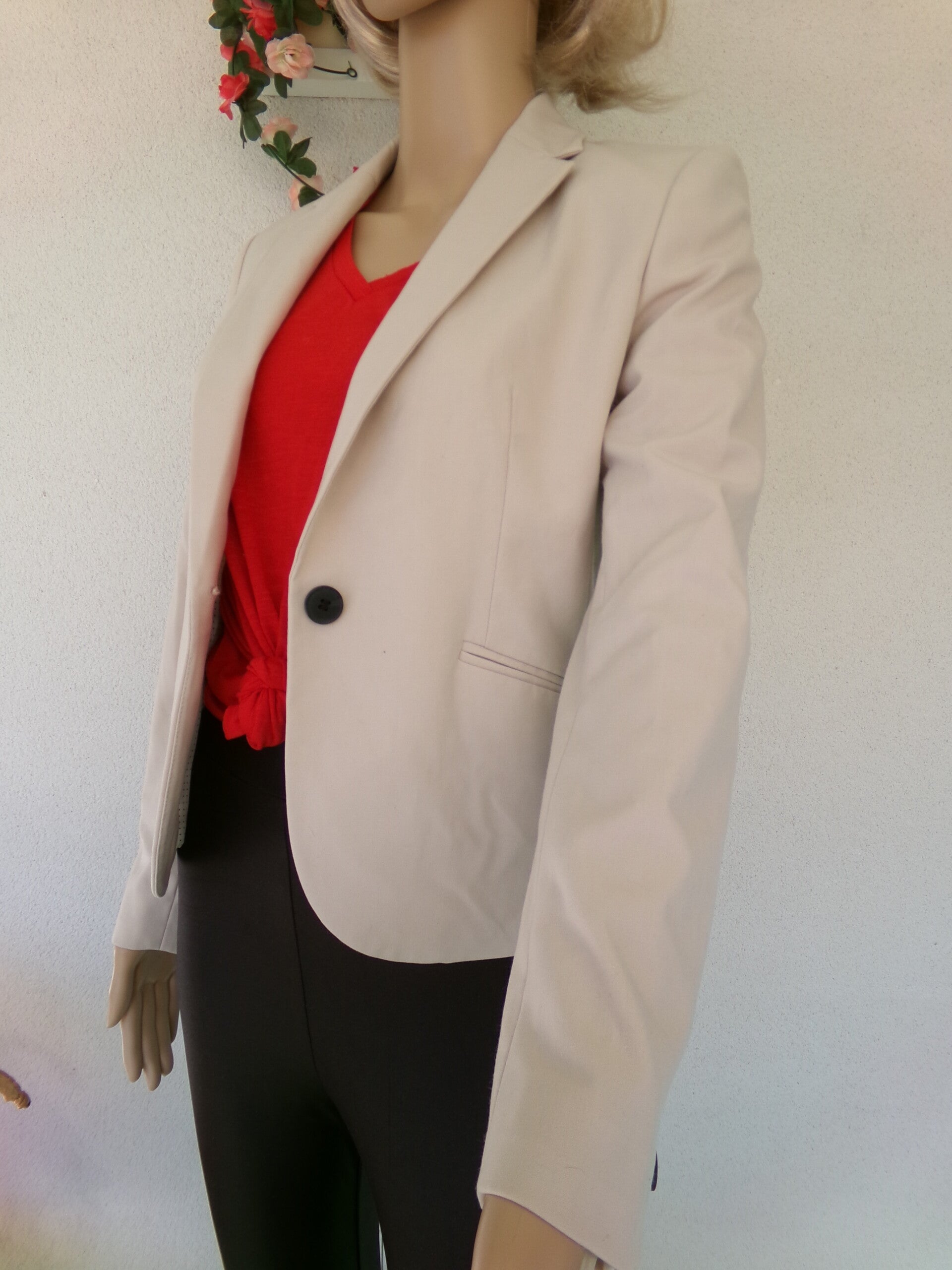 Veste stylée courte, fermeture un bouton, doublée, jolie à souhait,