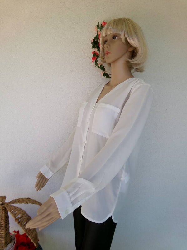 Chemise blanc très fluide, deux poches en haut devant, fermeture à boutons, col V, très stylée et jolie !