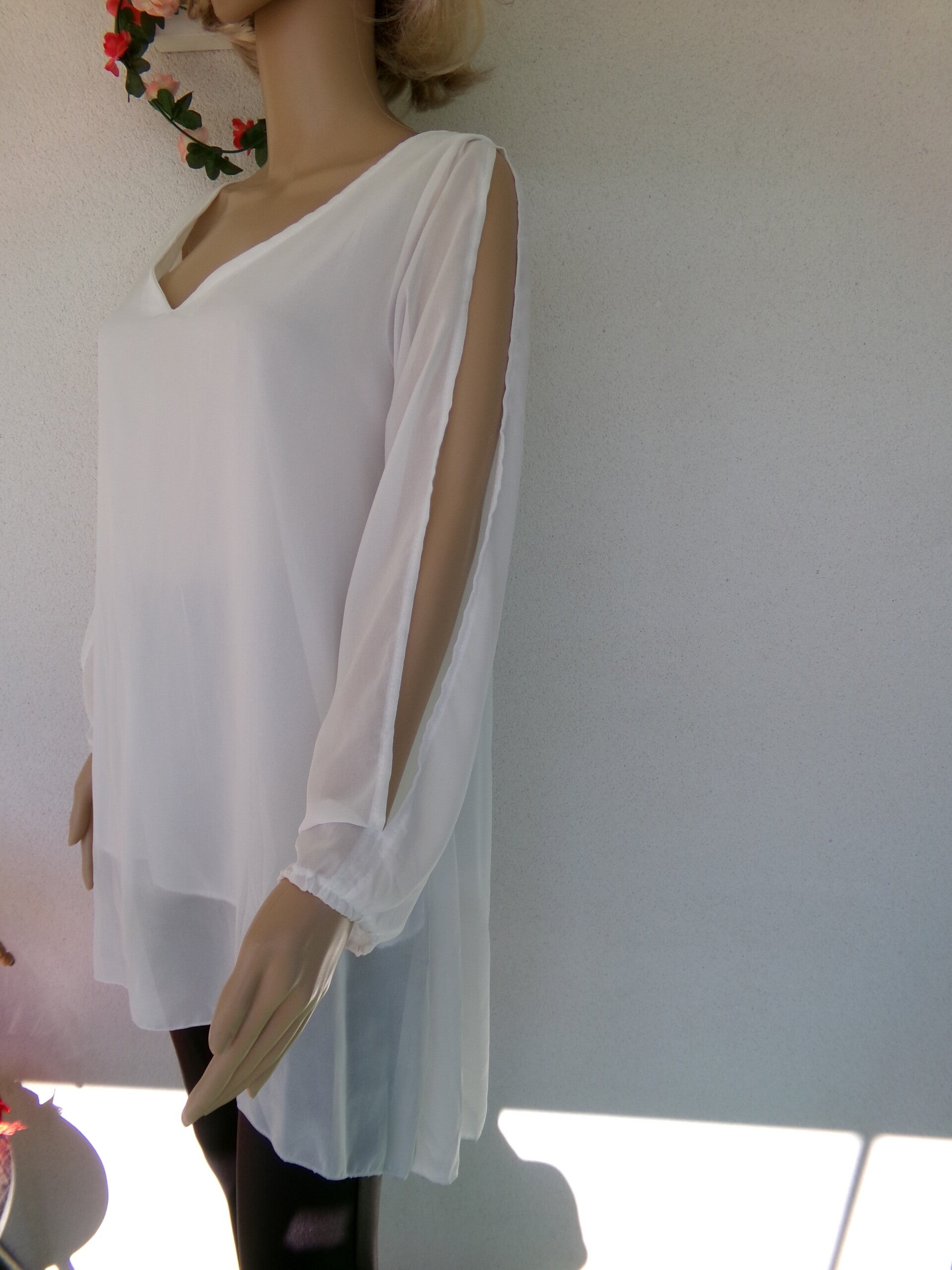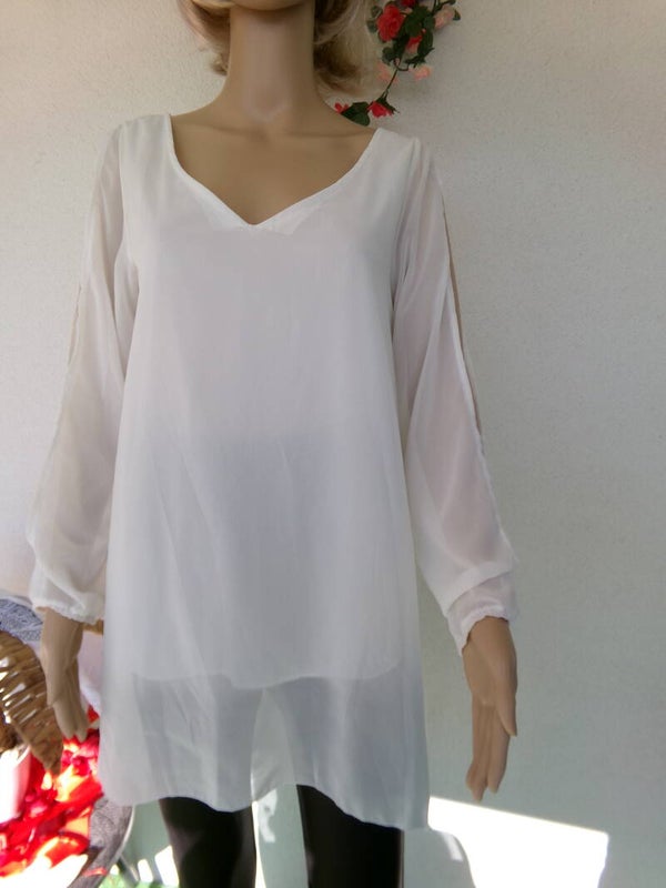 Robe blanc large à porter en tunique ou robe courte très stylée, Manches découpées du haut en bas, ce qui lui donne un charme fou et entièrement doublée, de très bonne qualité ! Col V