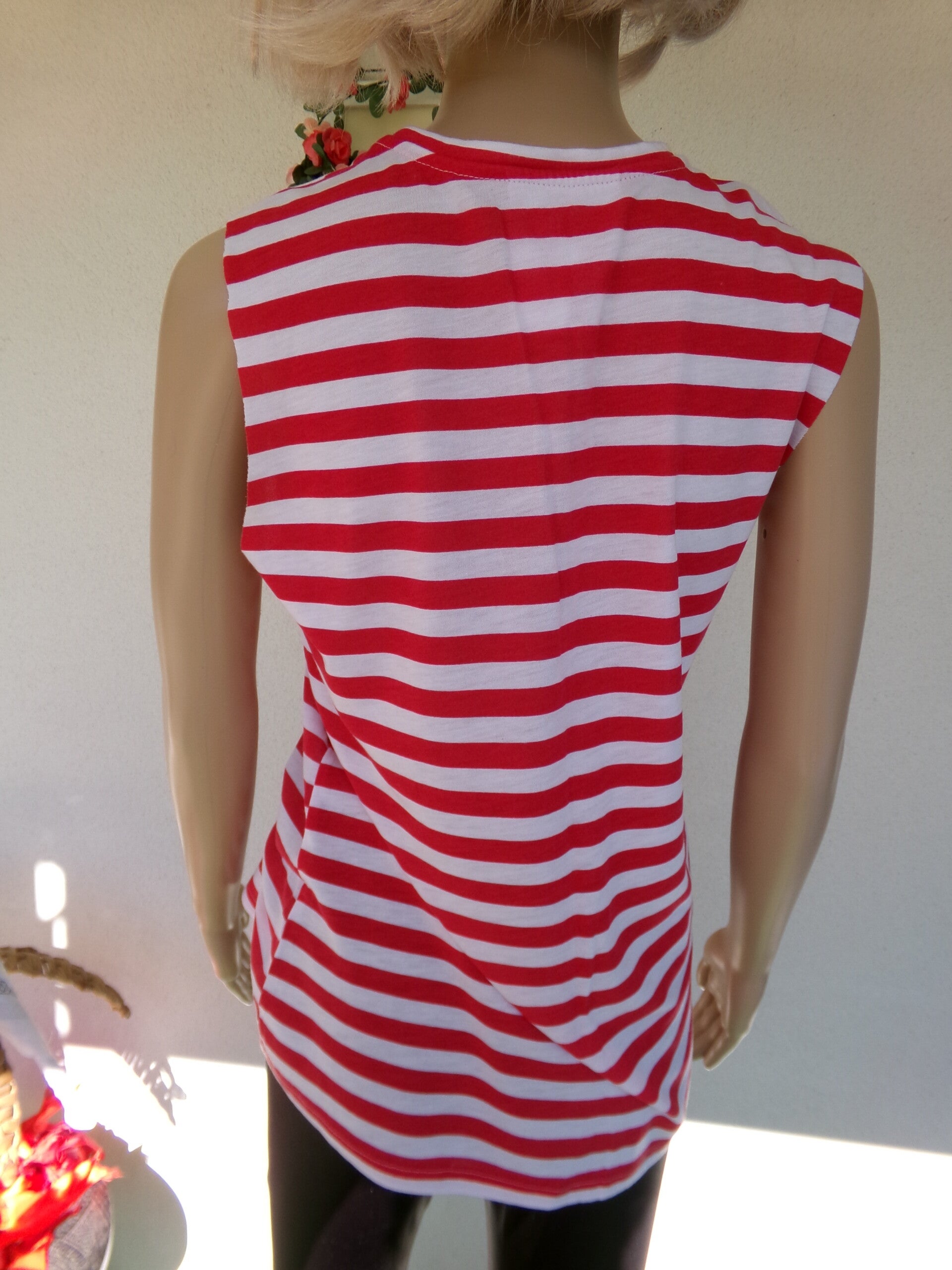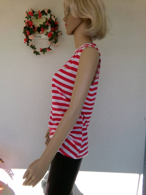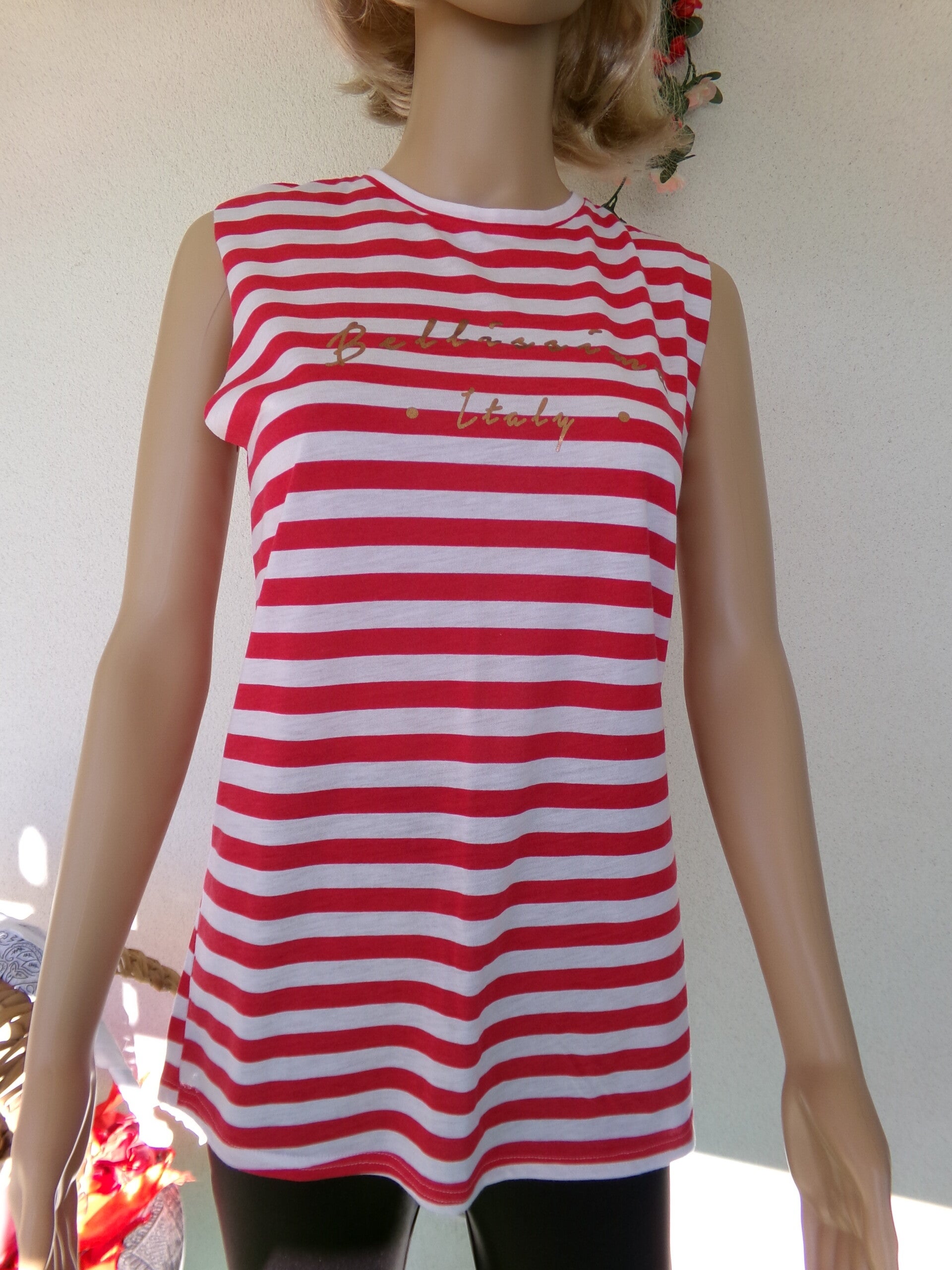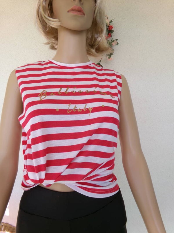 Haut à lignes avec inscription en or, sans manche, qui lui donne son petit charme, peut se porter de toutes les façons désirées selon votre imagination ou simplement à votre guise !