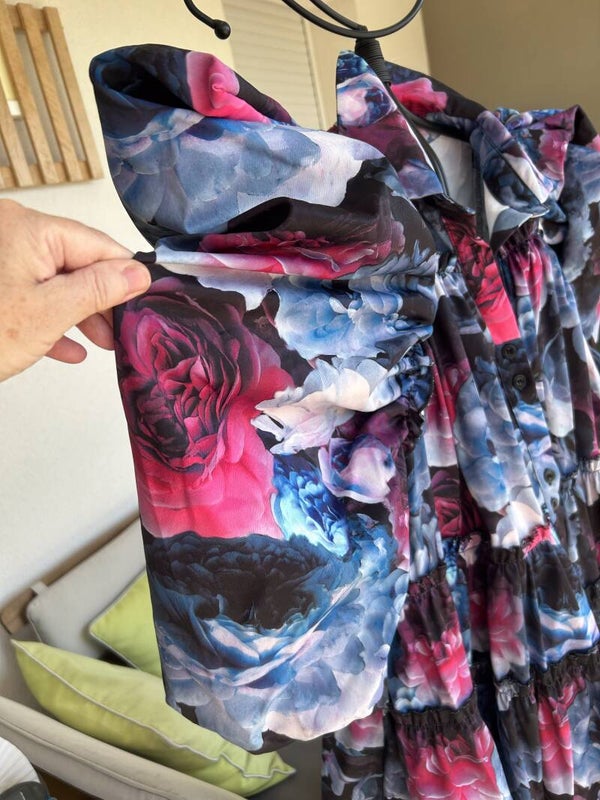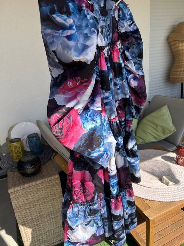 Fermeture devant boutonnées originalement, et, manches magnifiques, aamples et originales comme jamais, un vrai délice pour les yeux cette robe !