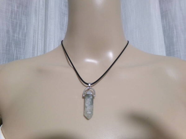 PENDENTIF POINTE 30MM (POINTE) FLUORITE VERT TRANSPARENT HOMME FEMME CORDON CUIR NOIR OU CHAINE AU CHOIX