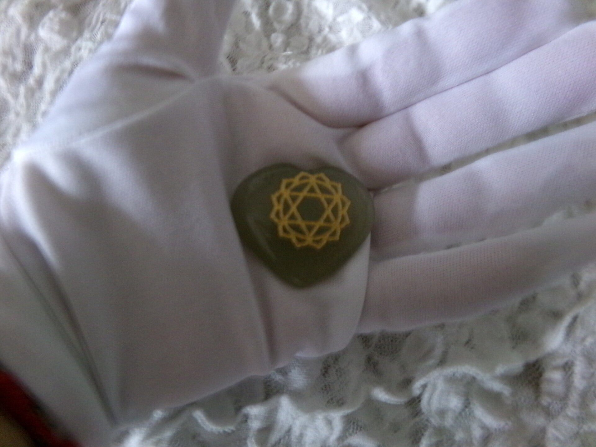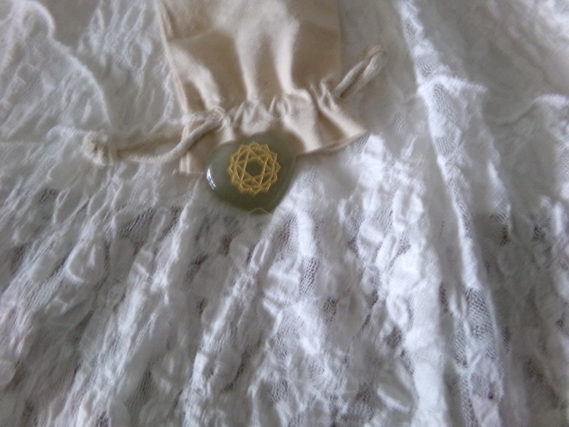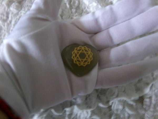 Amulette COEUR en Aventurine verte, Veritable Fétiche qui accorde amour inconditionnel et compassion associé à son Icône De d'Anahata, magnifiquement dorée sur le dessus.