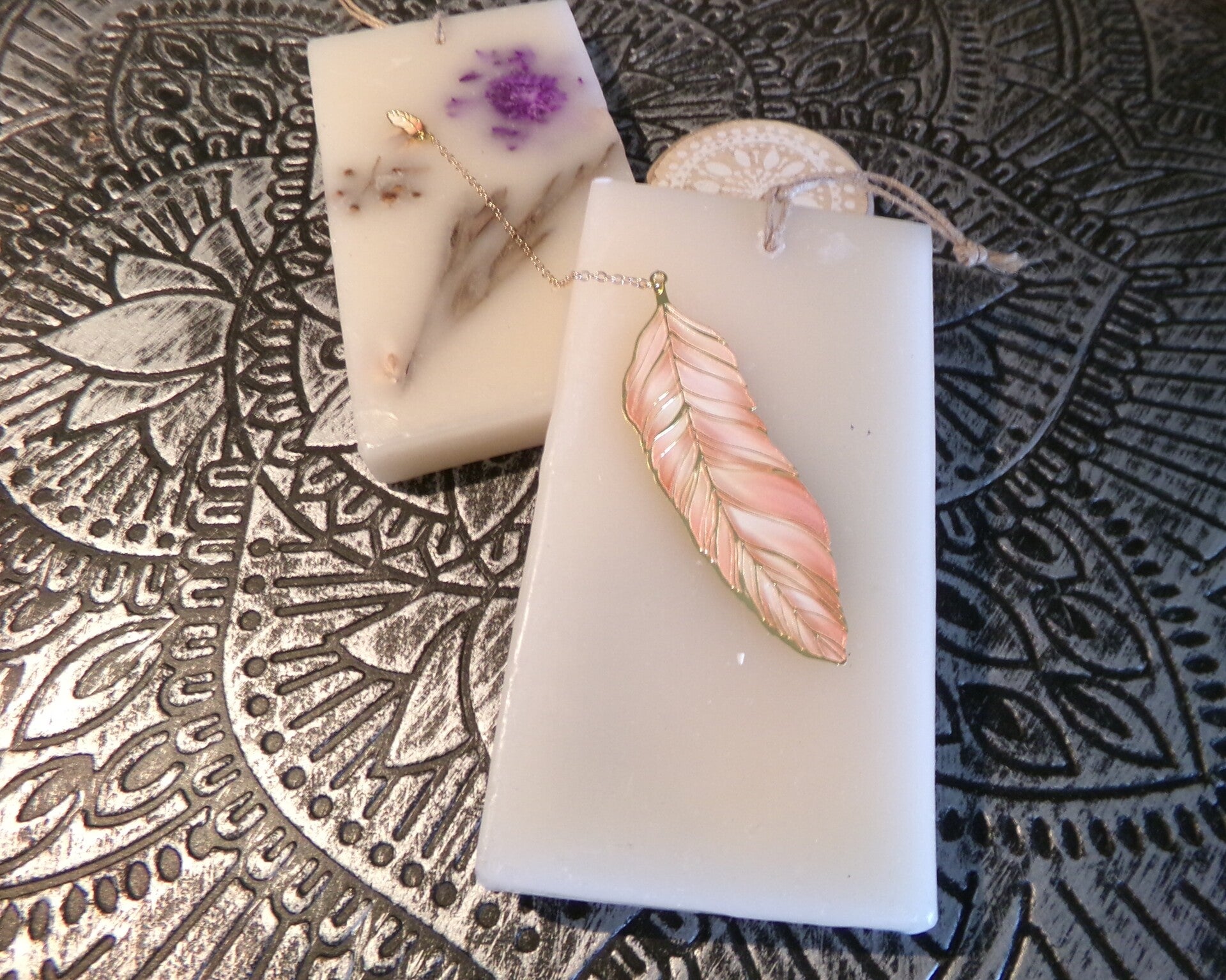 Marque page en métal FEUILLE bordures or Couleur Rose avec une magnifique petite feuille délicatement attachée à elle avec sa superbe chaînette.